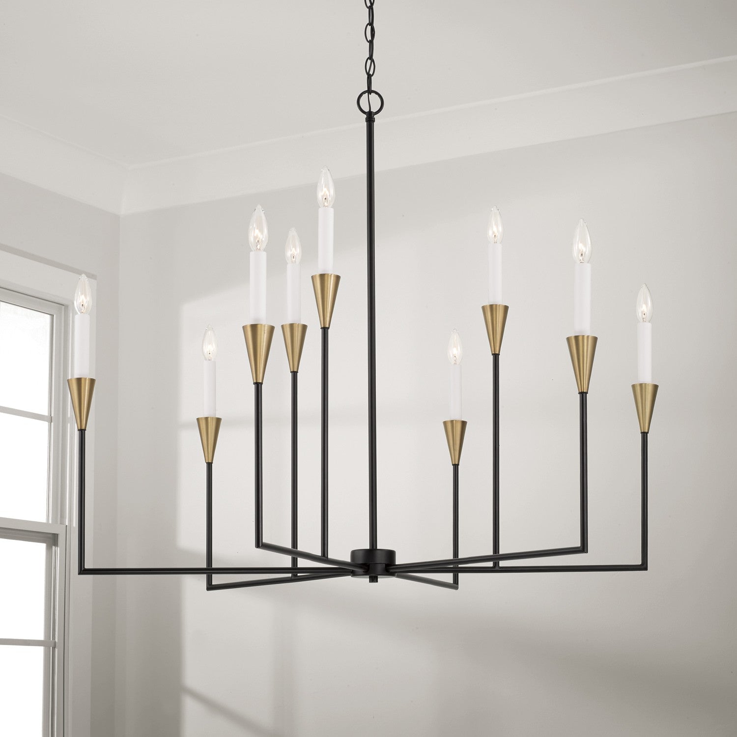 Create striking elegance with the Ava Large Chandelier. The pointed Aged Brass bobeches and squared Matte Black arms evoke a stunning, distinct style, while the interchangeable Aged Brass or Matte White candle sleeves offer a tailor-made feel.