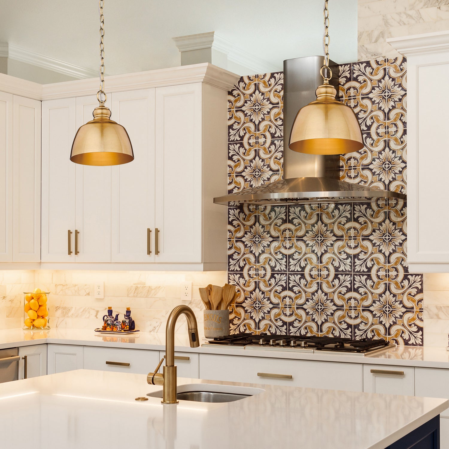 Capture authentic farmhouse charm with the Brushed Gold Collection. These transitional metal fixtures have classic bell-shaped silhouettes that pay homage to history. Sophisticated finishes add character and reinforces the look. The interiors of the metal shades are painted to match the exteriors. Place these damp-rated lights in any interior space.