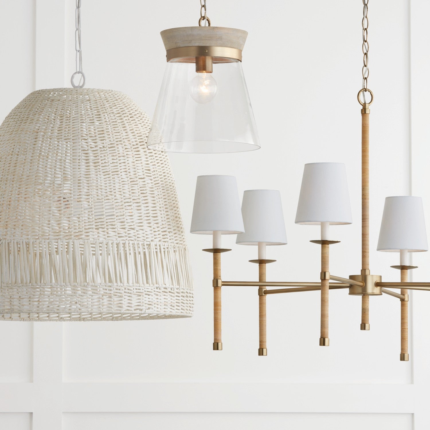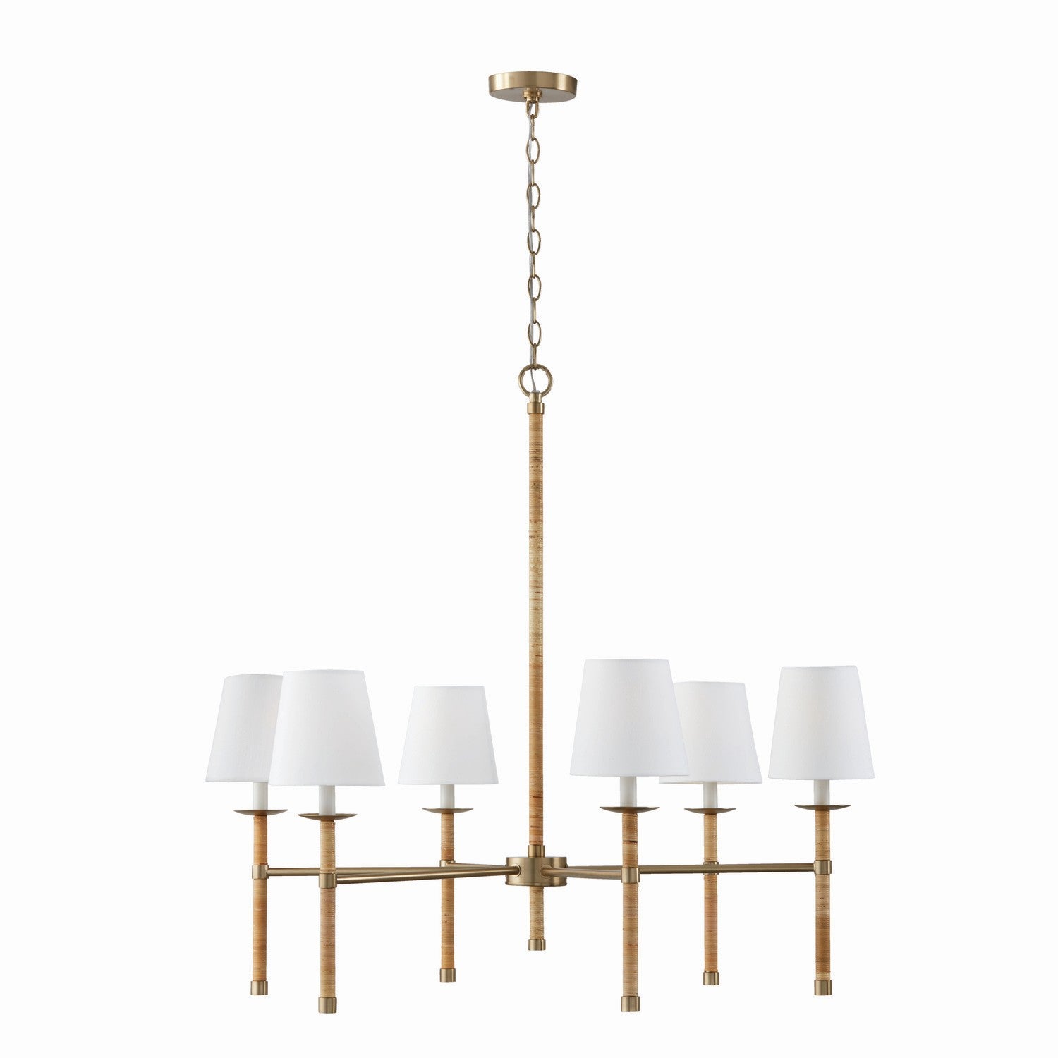 The Cabo Chandelier creates a new look on natural style. The handwrapped rattan on elongated arms pairs perfectly with crisp, white shades and hints of Matte Brass to bring bohemian chic to any space.