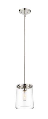 Targeted lighting illuminates a nook or reading space, bringing transitional charm built-in to the Cale one-light mini pendant light. Continue a stylish design scheme with this pendant featuring a hand-crafted matte black or polished nickel finish frame, down rod, and ceiling mount, contrasting with a sparkling tapered glass shade.