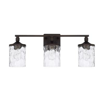 3 light vanity with a bronze finish and clear water glass. Also available in Aged Brass, Brushed Nickel and Matte Black.