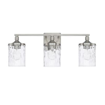 3 light vanity with brushed nickel finish and clear water glass. Also available in Aged Brass, Matte Black and Bronze.