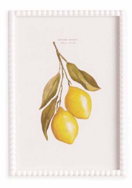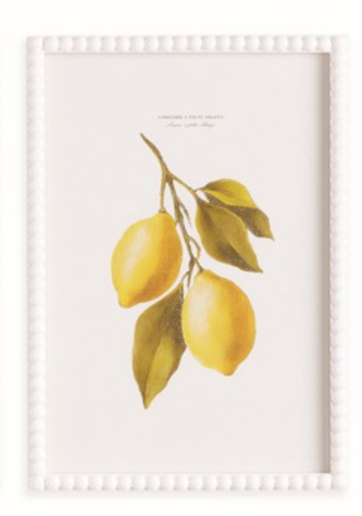These lemon cuttings offer an illustrator's interpretation of this familiar citrus fruit. It highlights the subtlety of color and form in these bright and cheerful varieties. Wit a white wood frame with a traditional beaded detail, it makes the perfect trio for kitchen, powder room or study. Sold Individually