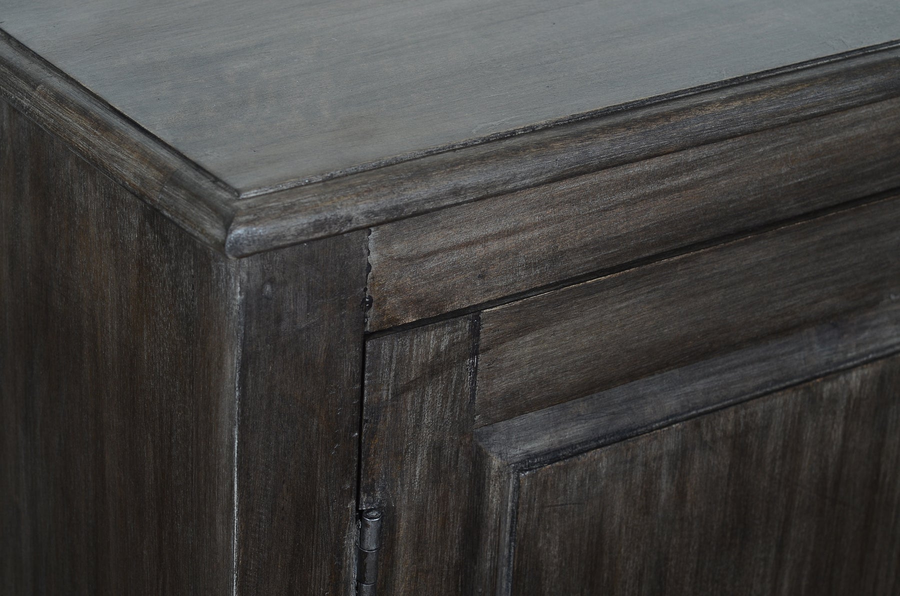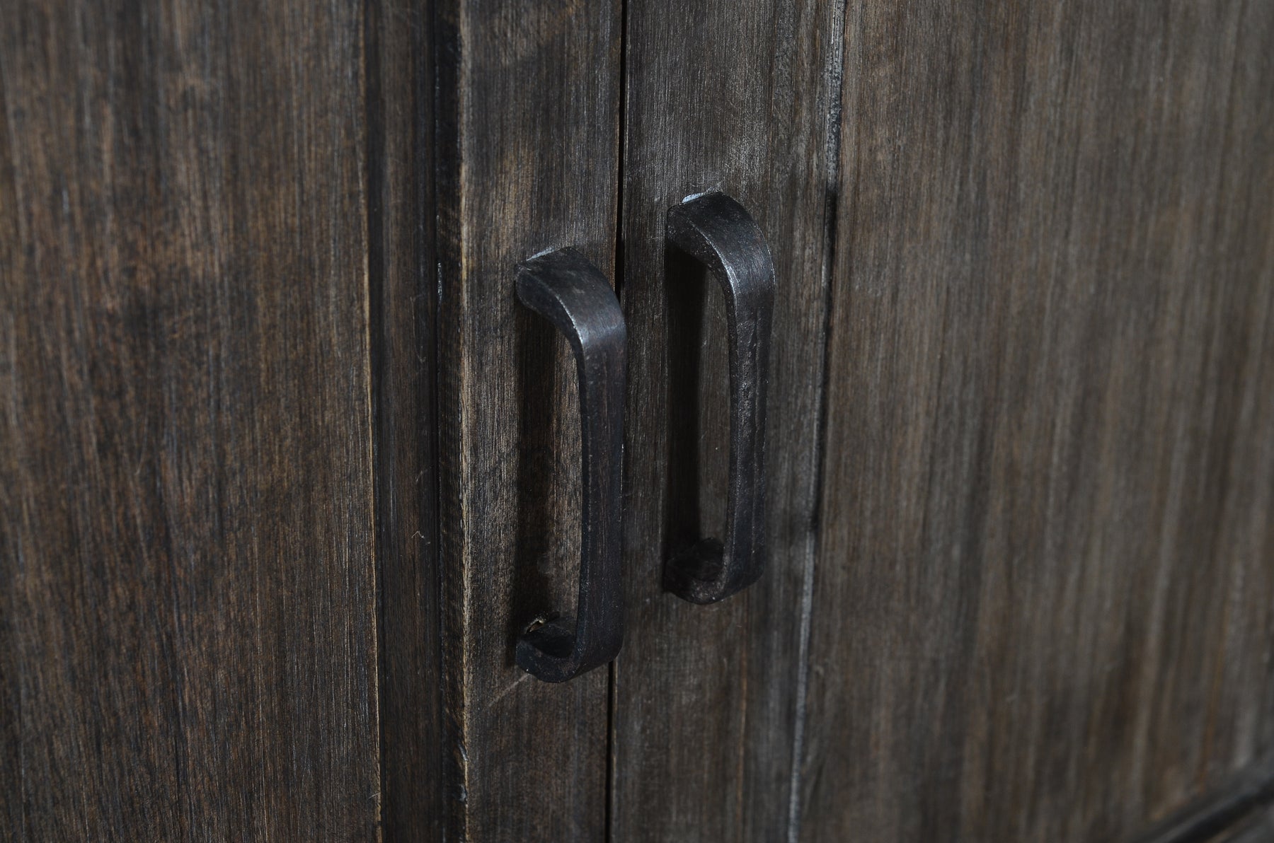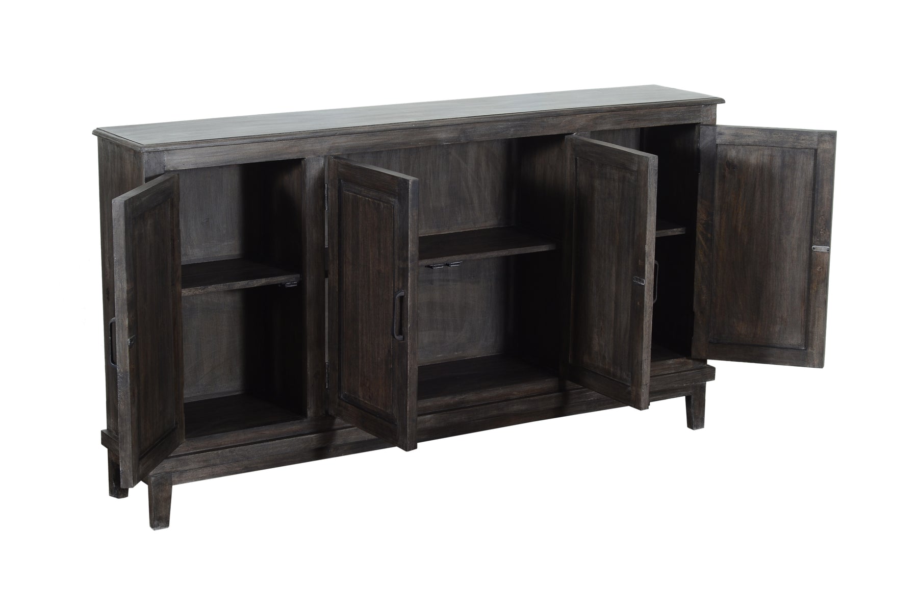 Harley Console - The Harley Console brings a bold presence with its rich, dark wood finish and streamlined silhouette. Crafted from solid wood, this four-door console offers ample storage with interior shelving, perfect for organizing essentials. The recessed panel doors and black metal hardware add a modern touch while maintaining a rustic charm. Whether used in an entryway, living room, or dining area, this piece blends function and the best of transitional style.