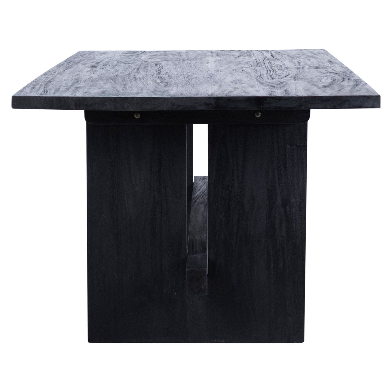 Design a beautiful place to gather with this modern Dining Table. This rectangular dining table features a solid, black teakwood top and dual pedestal base. Style this table with your dining chairs of choice and sculptural accents for a dining room that strikes a perfect moody aesthetic.