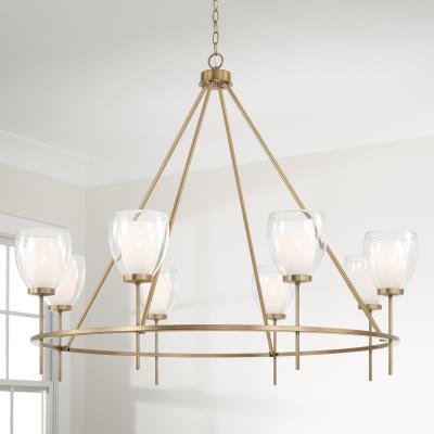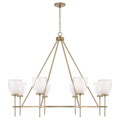 Chic curves and stunning details create the Josslyn Chandelier. The layered Soft White and Clear glass delivers glamorous dimension, while the Aged Brass finish adds visual warmth to the sleek lines for an all-around captivating luminaire. Available in six light or eight light.
