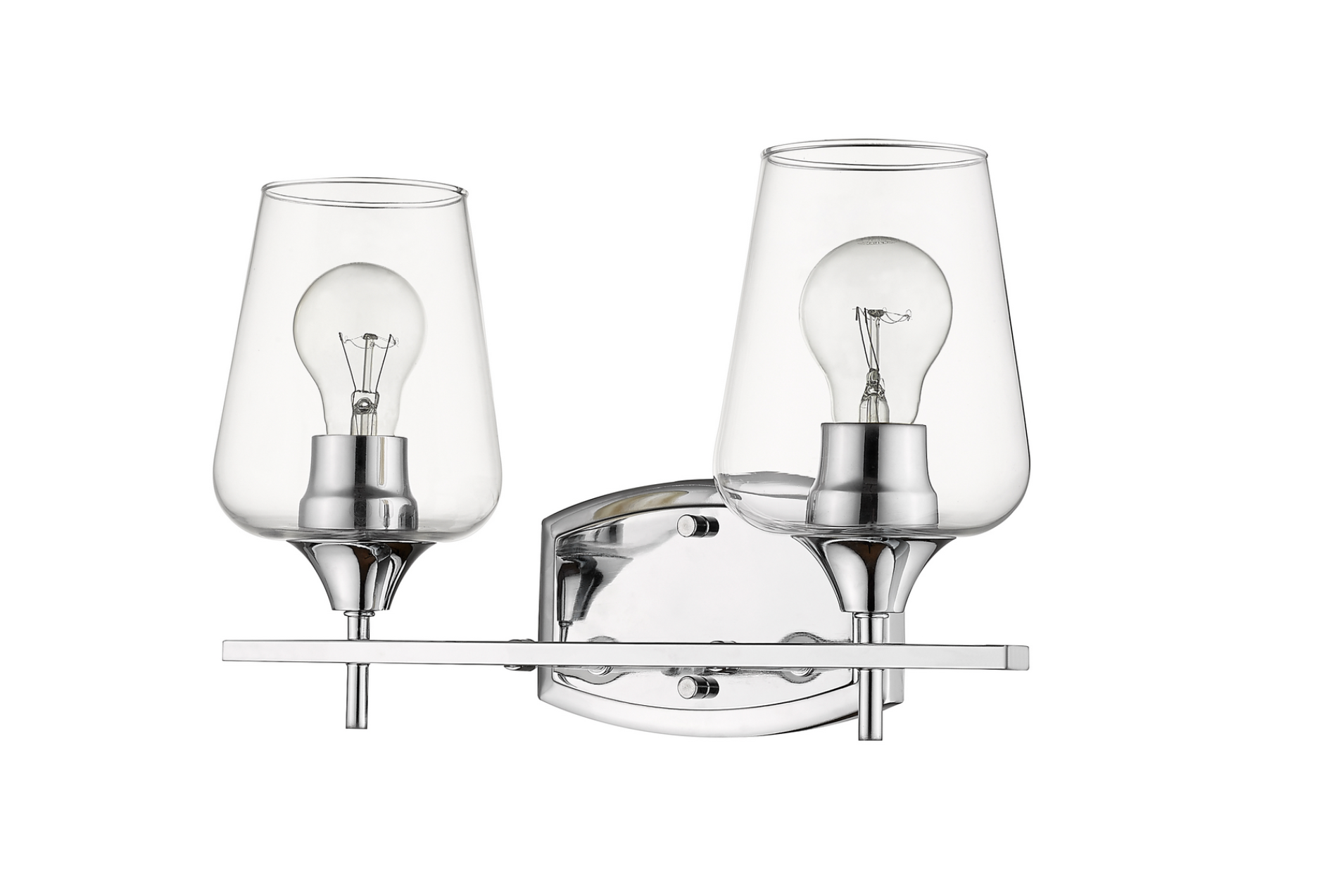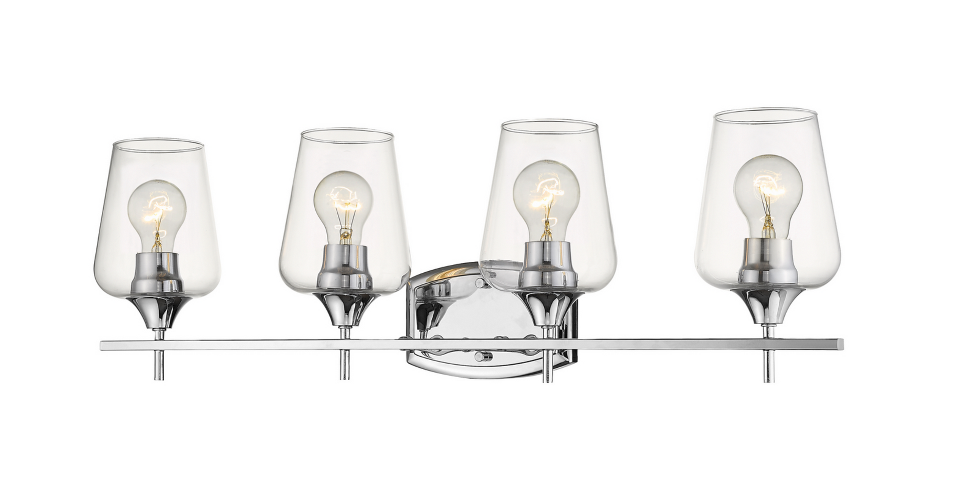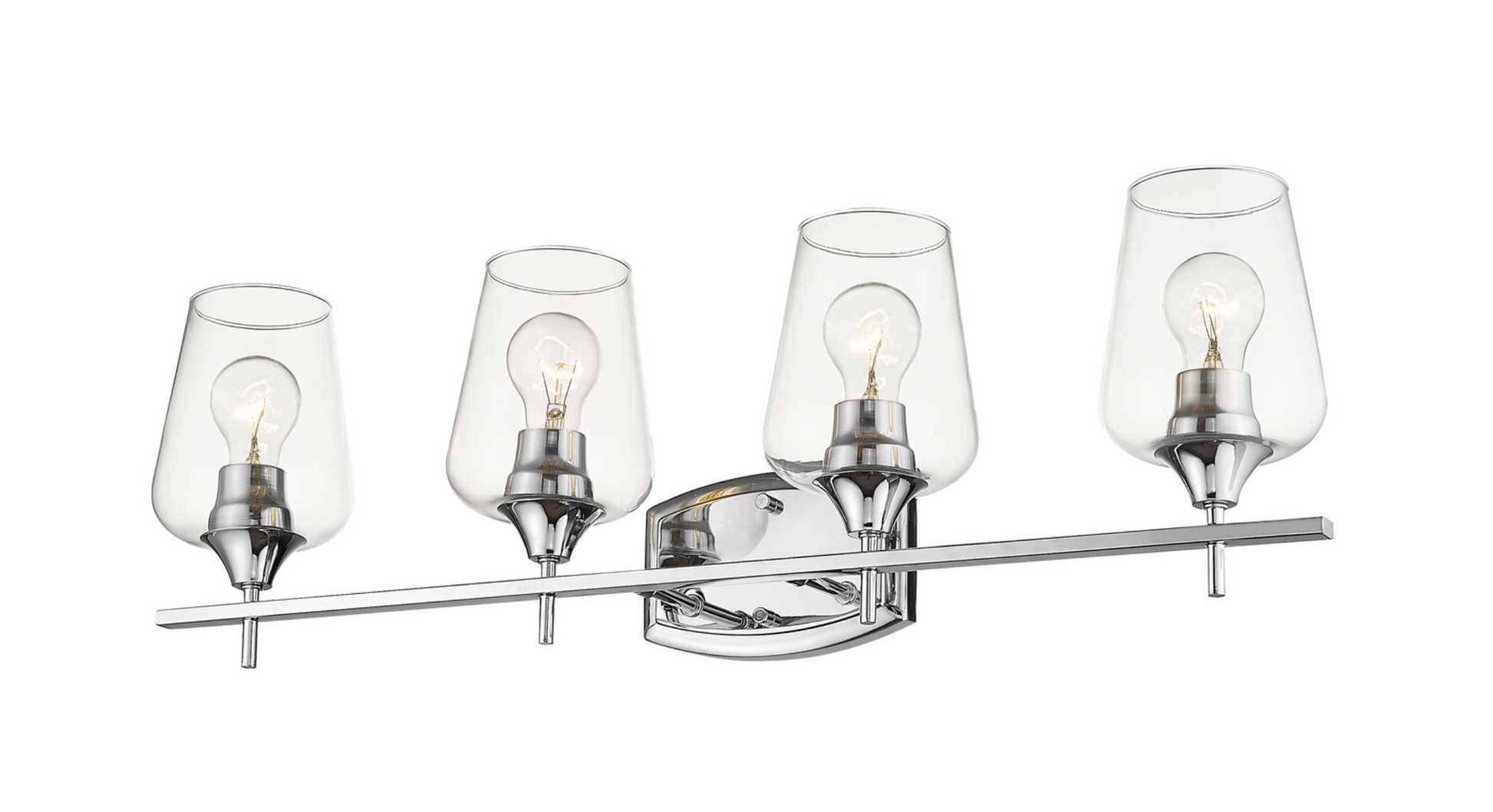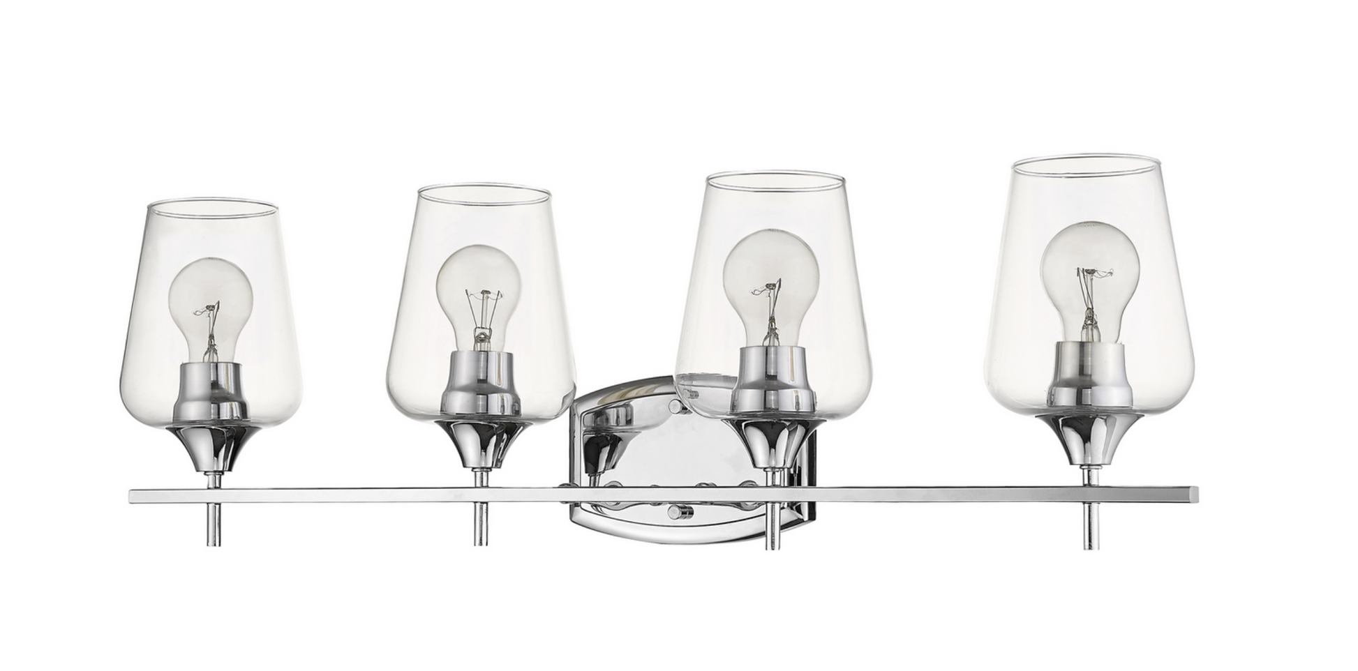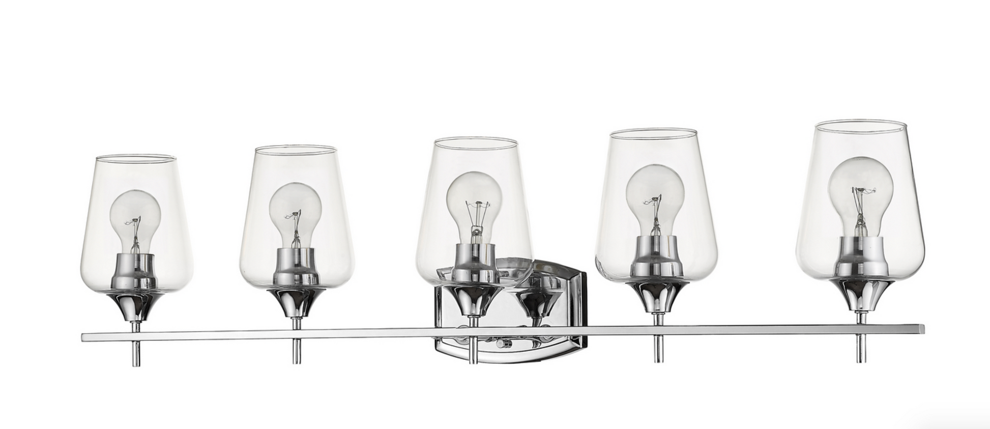 Upscale sophistication with a Mid Century Modern vibe tells the story of this elegant vanity light. A blend of delightful materials offers stunning large glass shades with a chrome finish metal, delivering a dramatic palette that embellishes the look of any transitional bath space in style. Available in 2,3,4, and 5 light options.