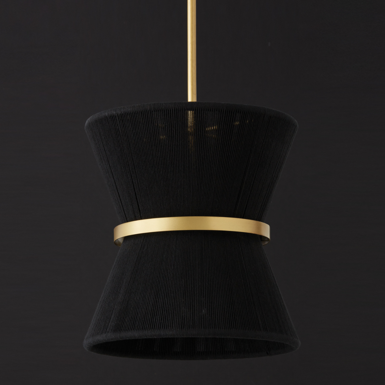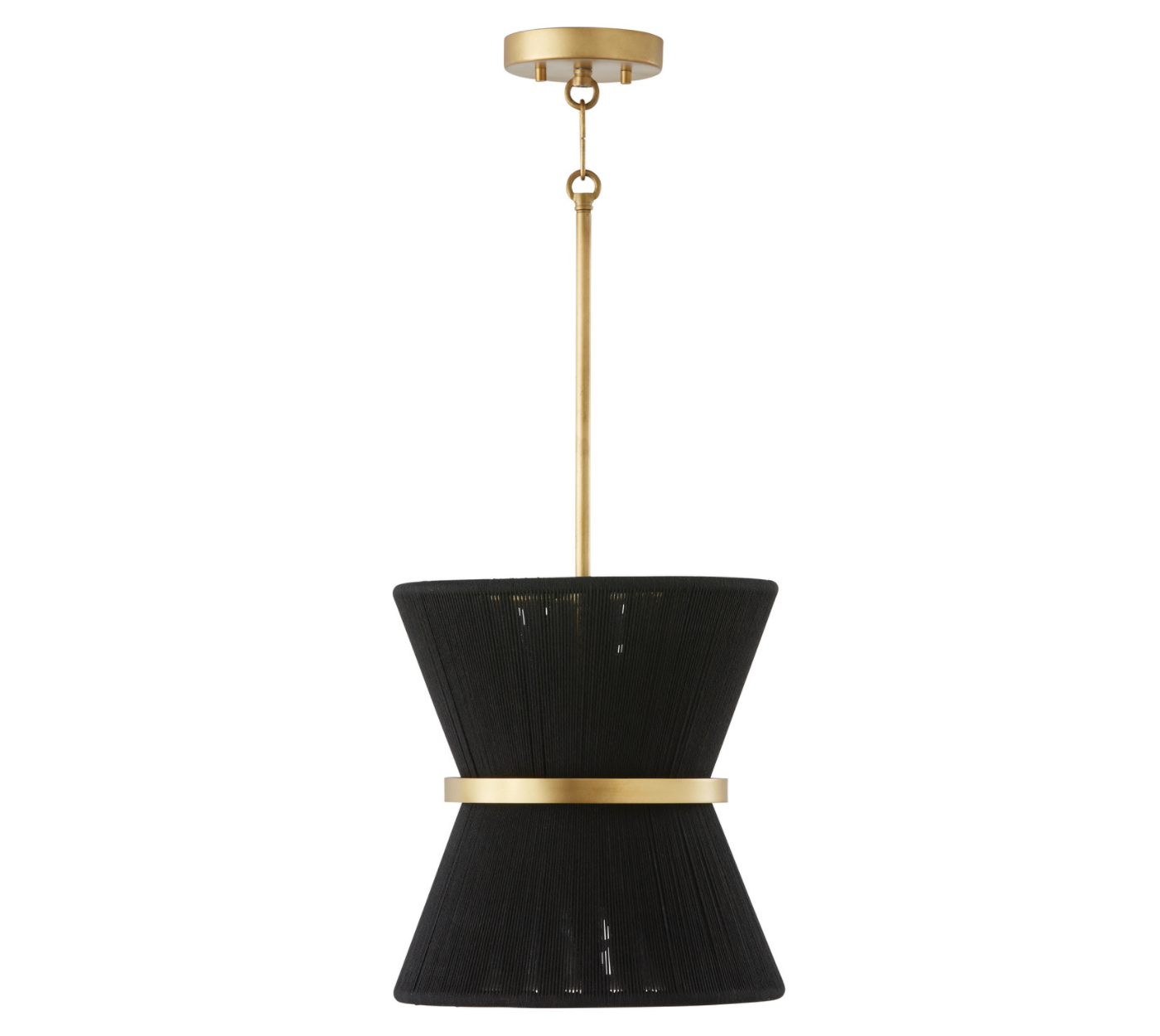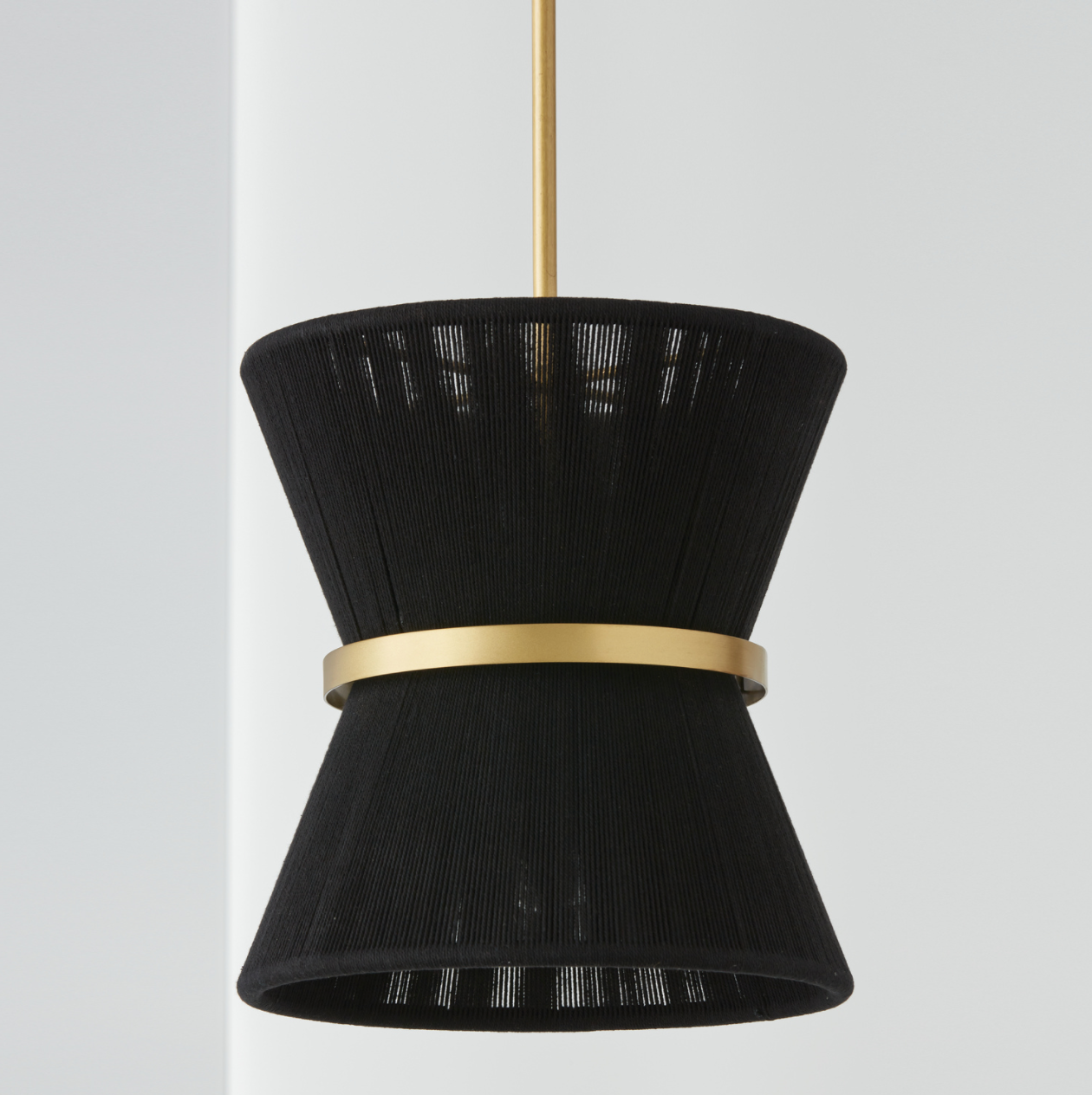 The classic shape of the Kylo 1-Light Pendant is reminiscent of old Hollywood style. The honey-toned, patina Brass band accentuates the artisan loomed hourglass silhouette made of black rope for eye-catching elegance. Also available in bleached rope