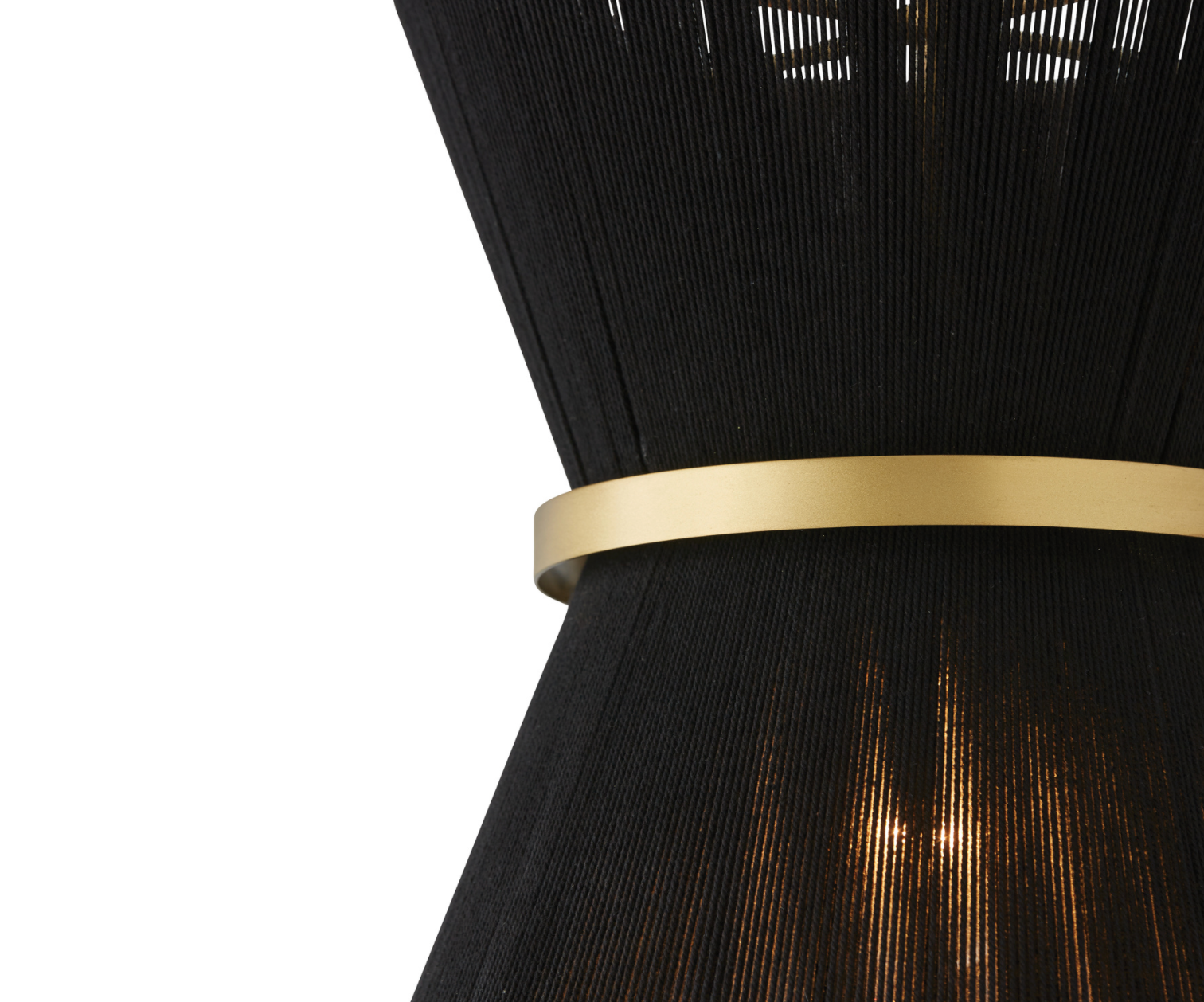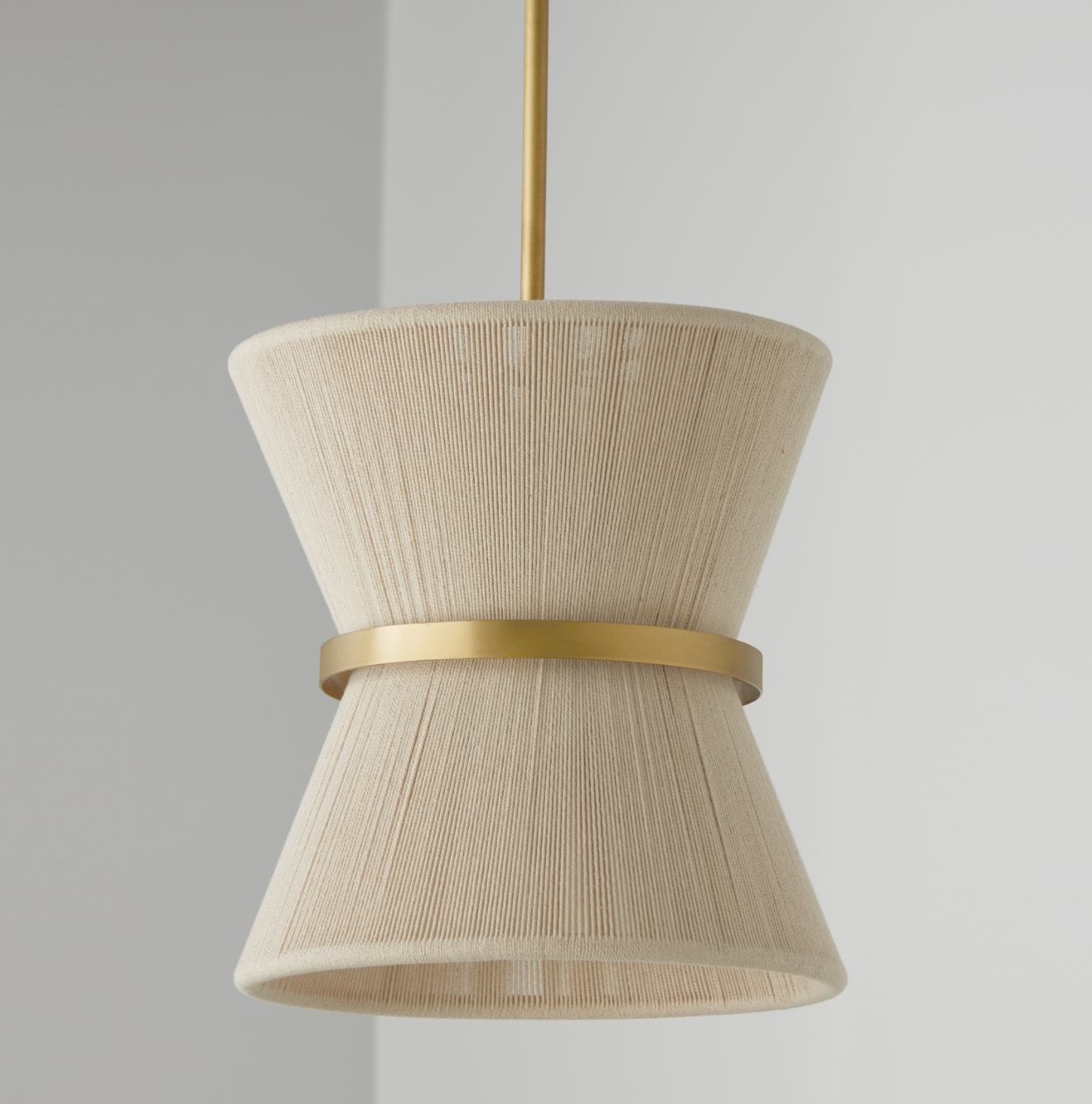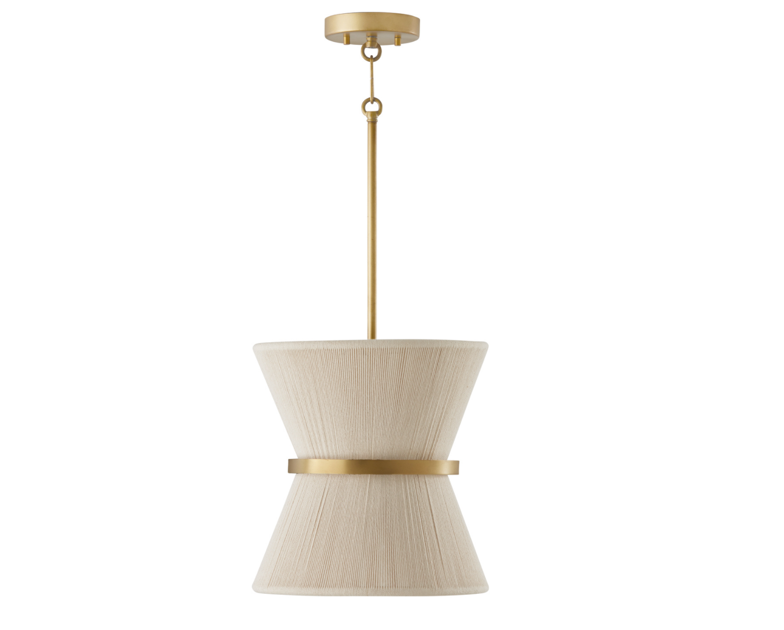 The classic shape of the Kylo 1-Light Pendant is reminiscent of old Hollywood style. The honey-toned, patina Brass band accentuates the artisan loomed hourglass silhouette made of black rope for eye-catching elegance. Also available in bleached rope