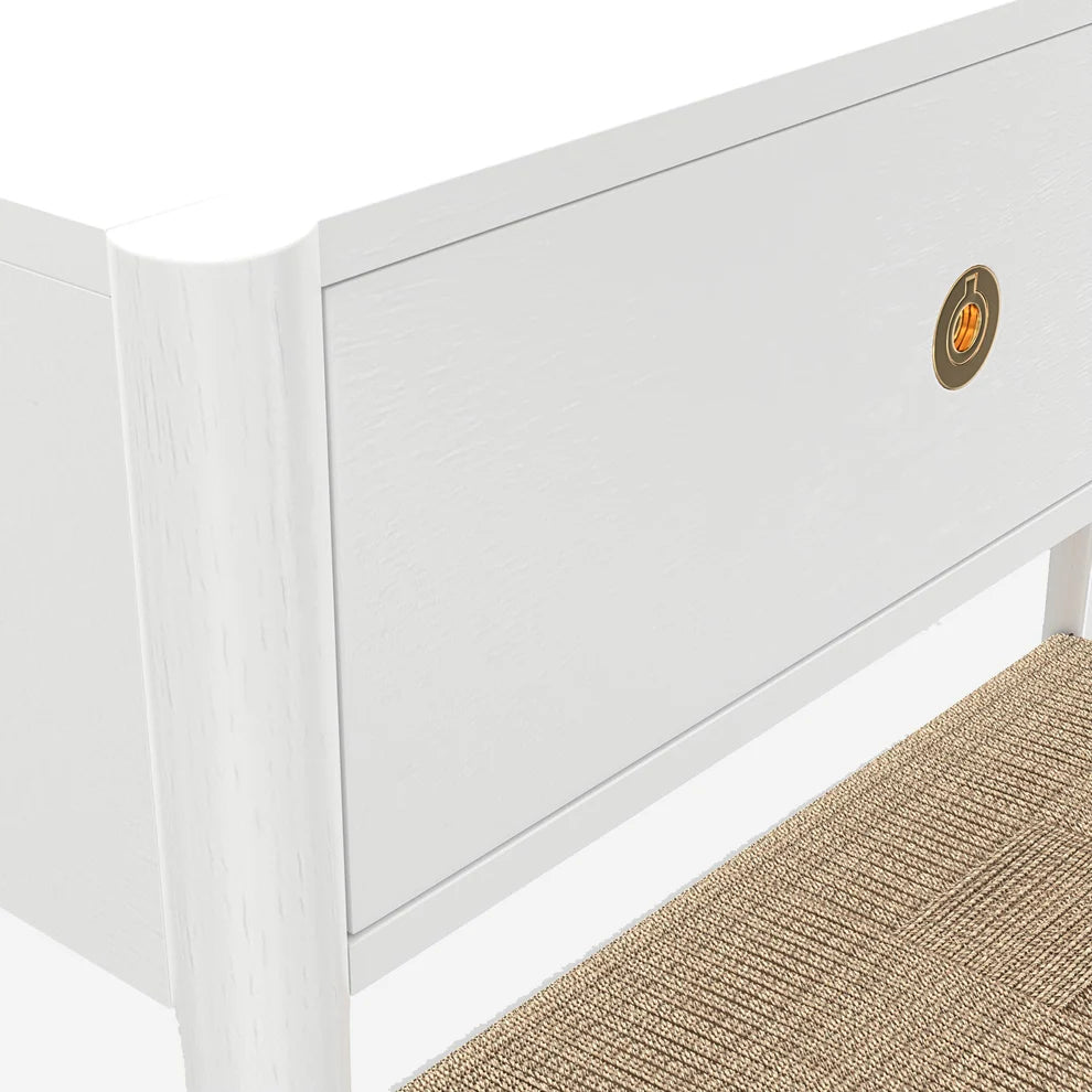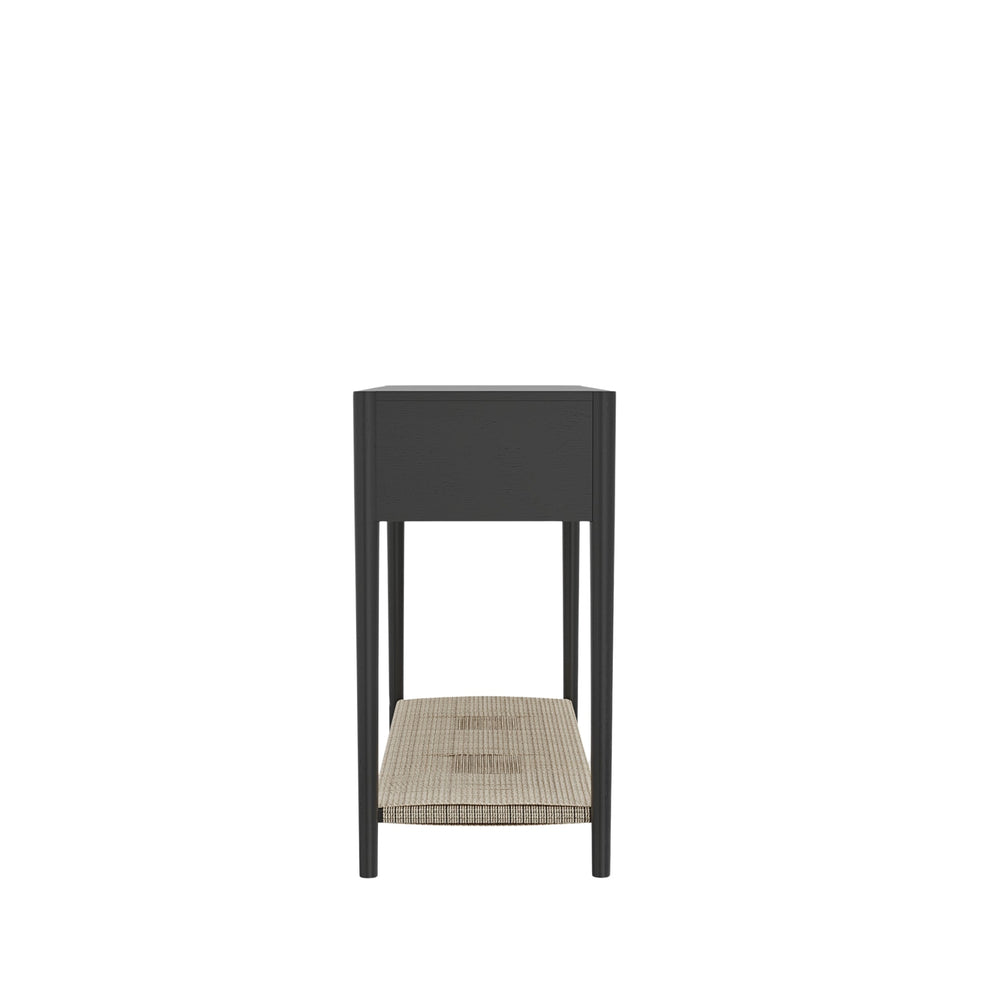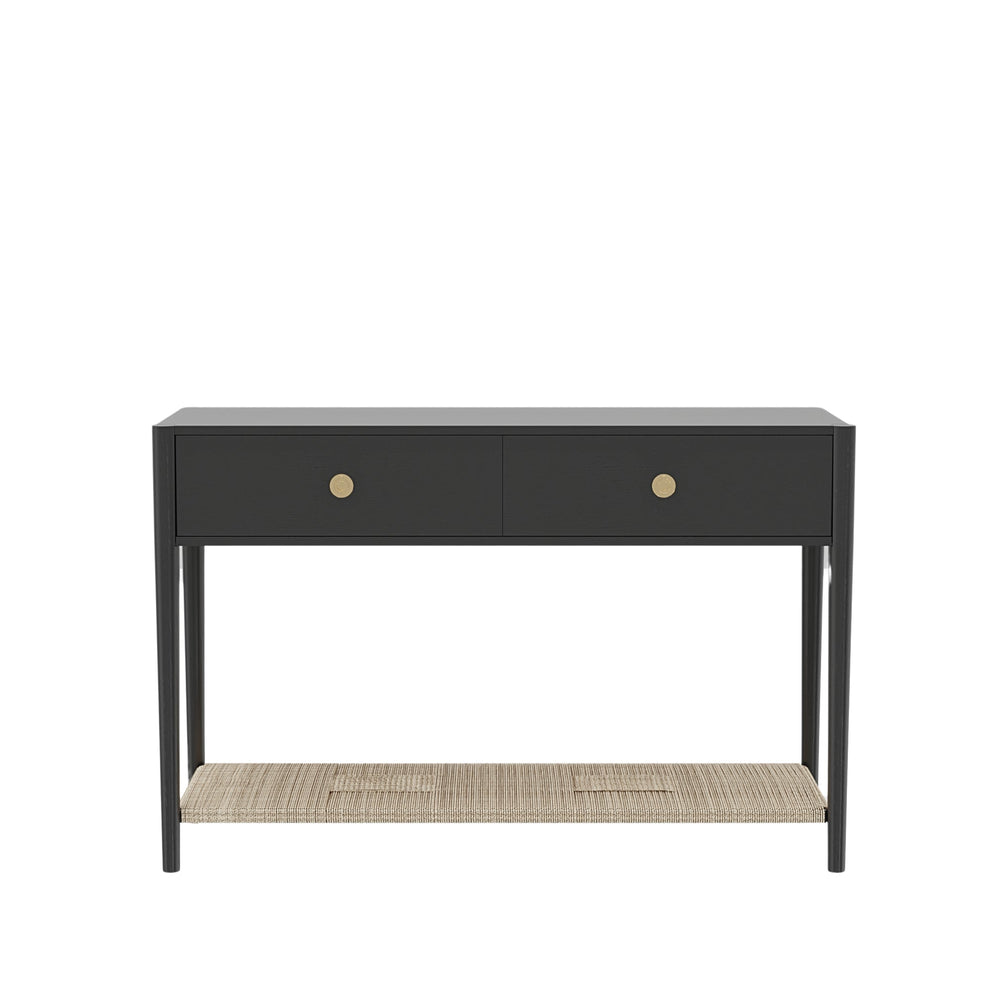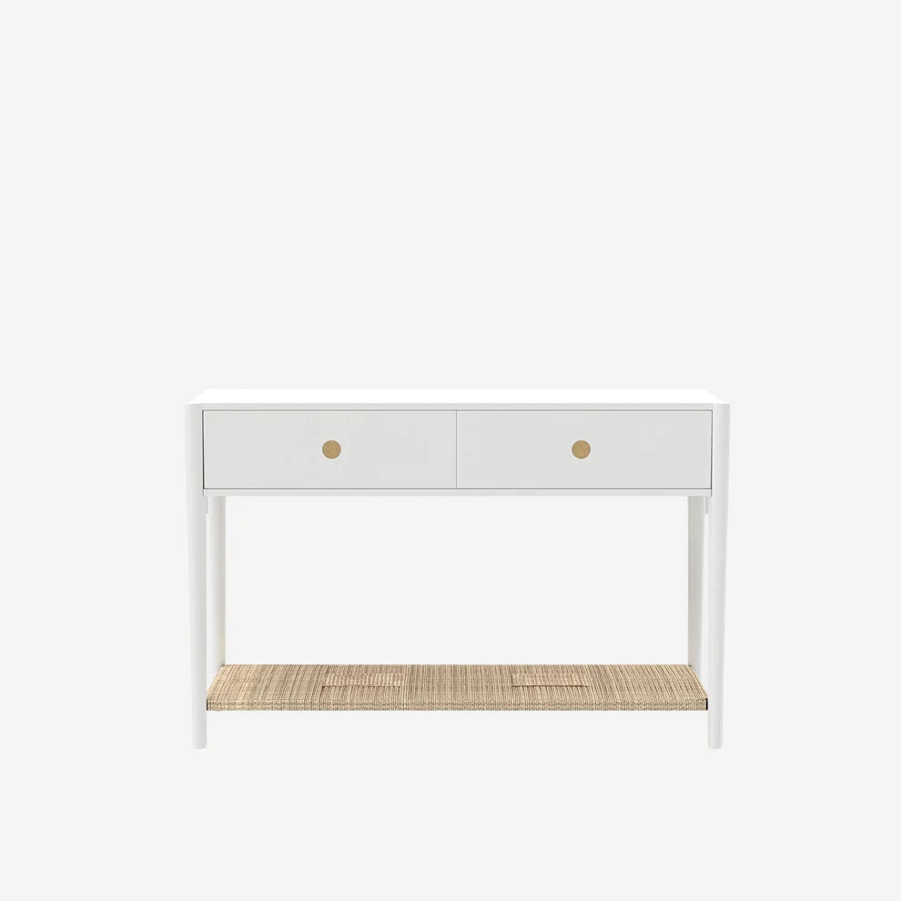 Add timeless elegance to your entryway or living space with the Leo Console Table. Featuring a woven bottom shelf for added texture and storage, this console is designed with two smoothly gliding drawers on metal ball-bearing tracks. The brass-finish knobs provide a refined touch, while its fully assembled construction ensures effortless setup. Whether placed in a hallway, behind a sofa, or as a statement piece, the Leo Console Table offers both beauty and functionality. Available in Black or Coconut Milk