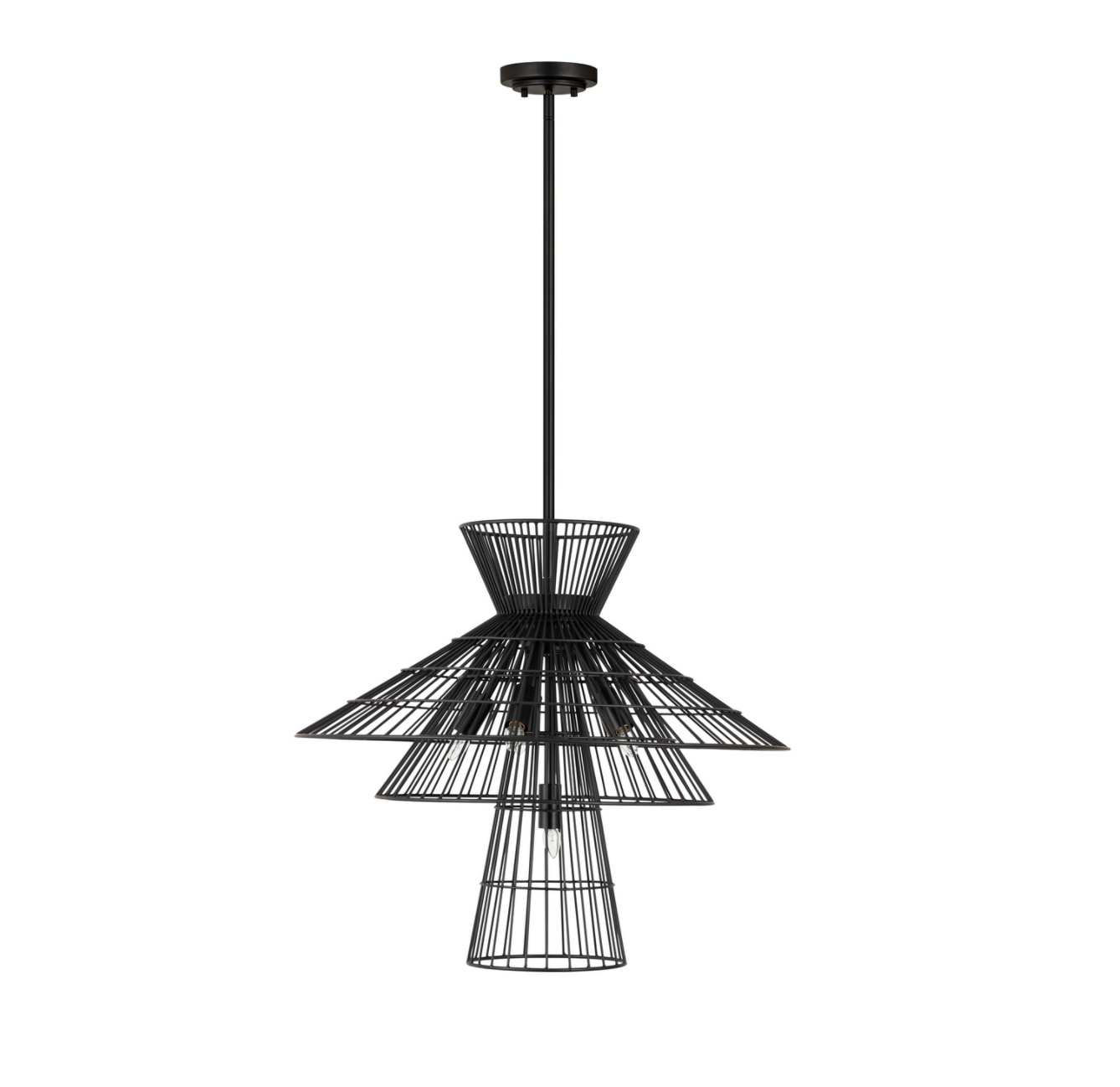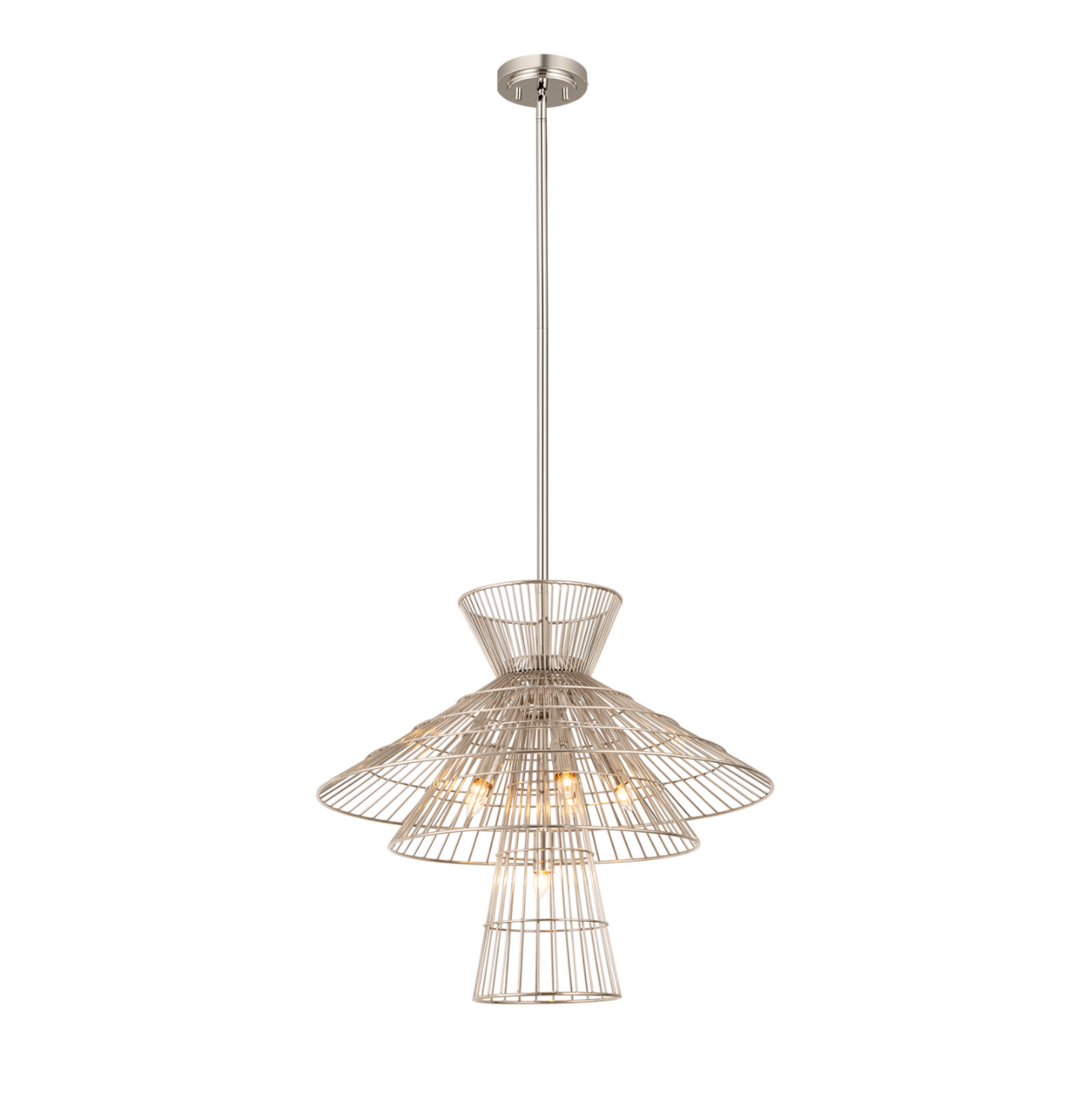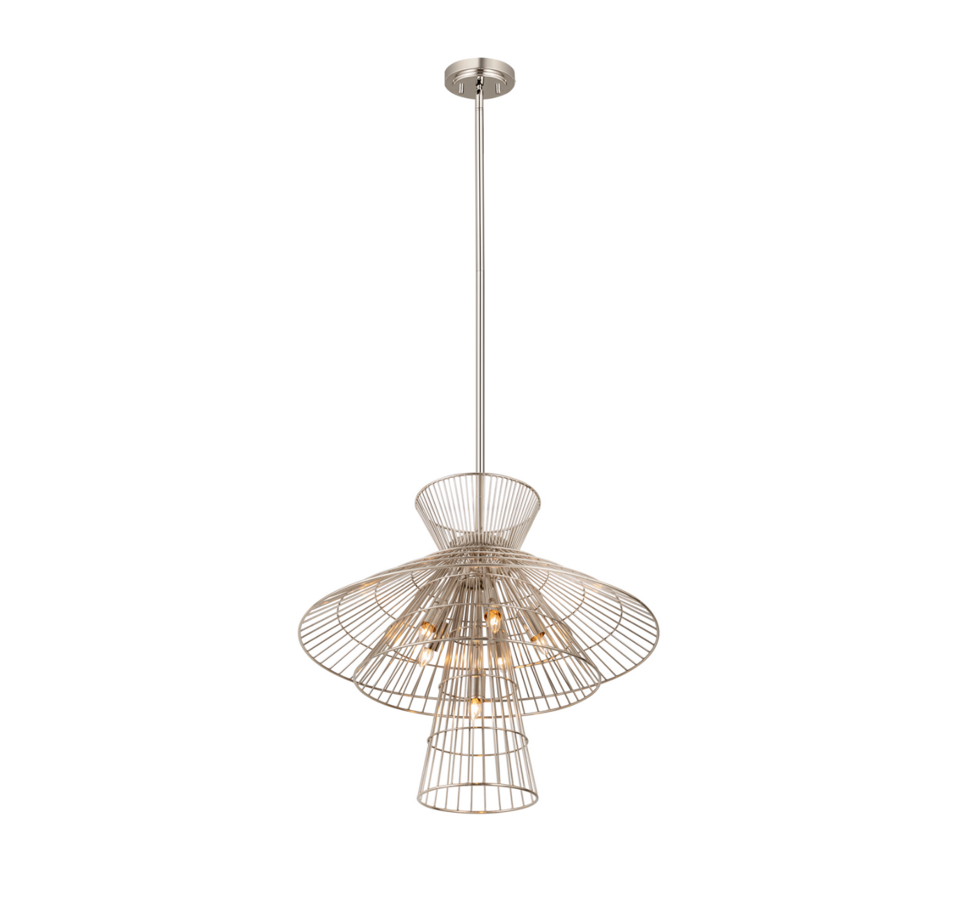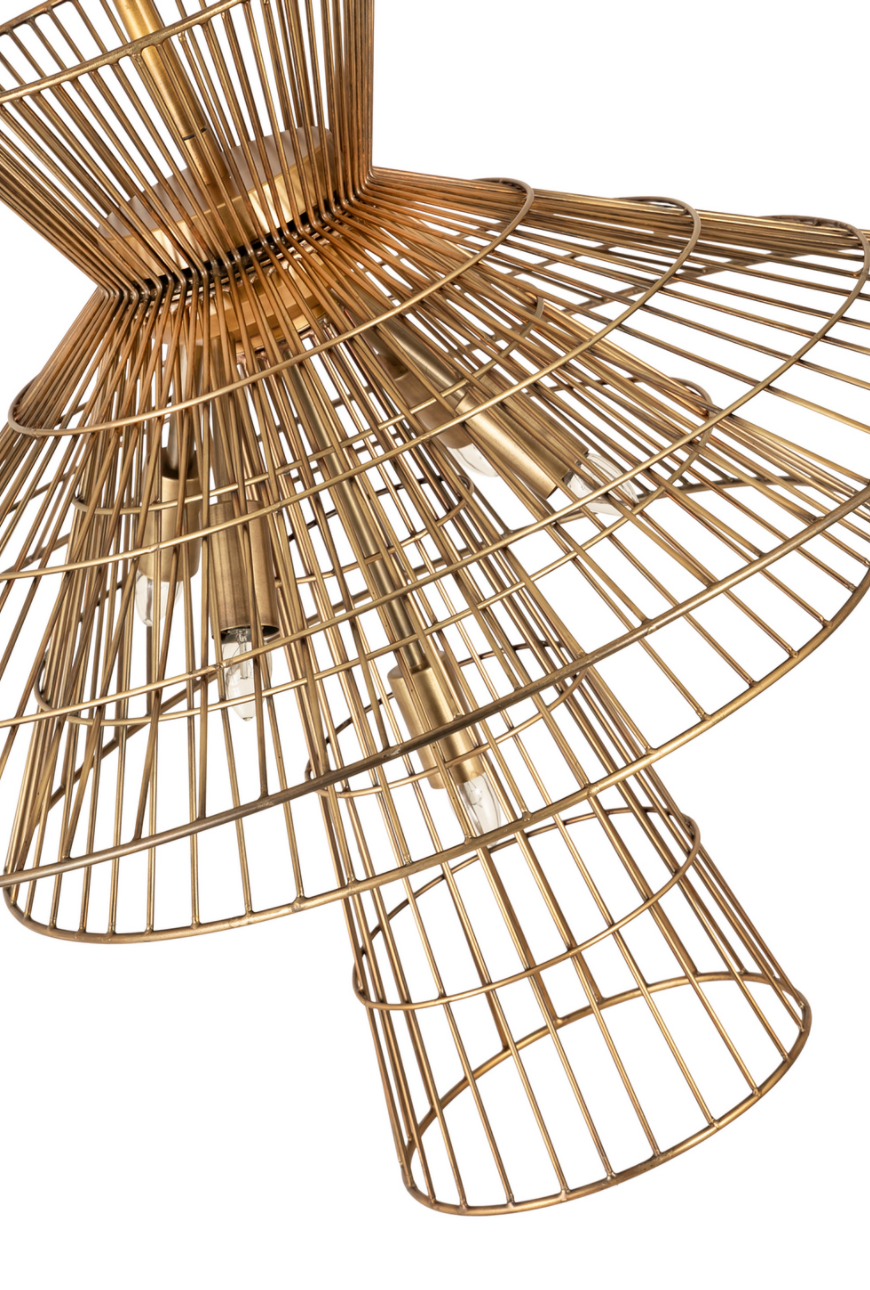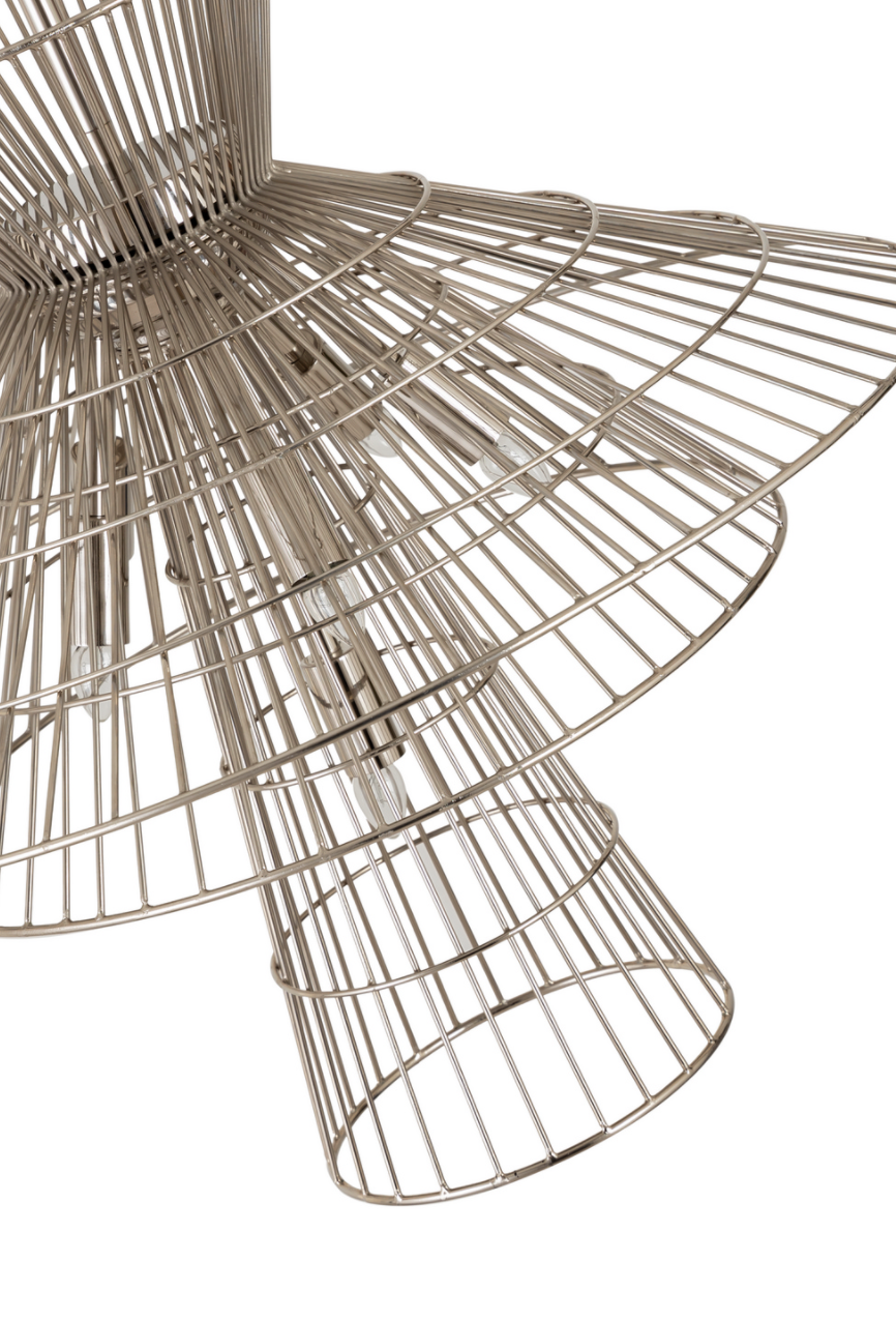 Offer up an energetic look while choosing lighting in a custom space, adding the Lolita six-light pendant to steal the show. Bold matte black, brass, or polished nickel finish iron crafts a tiered geometric arrangement of wired pieces and matching down rod and canopy. This striking fixture reflects a blend of industrial and modern styling. this item must ship freight or oversized UPS.