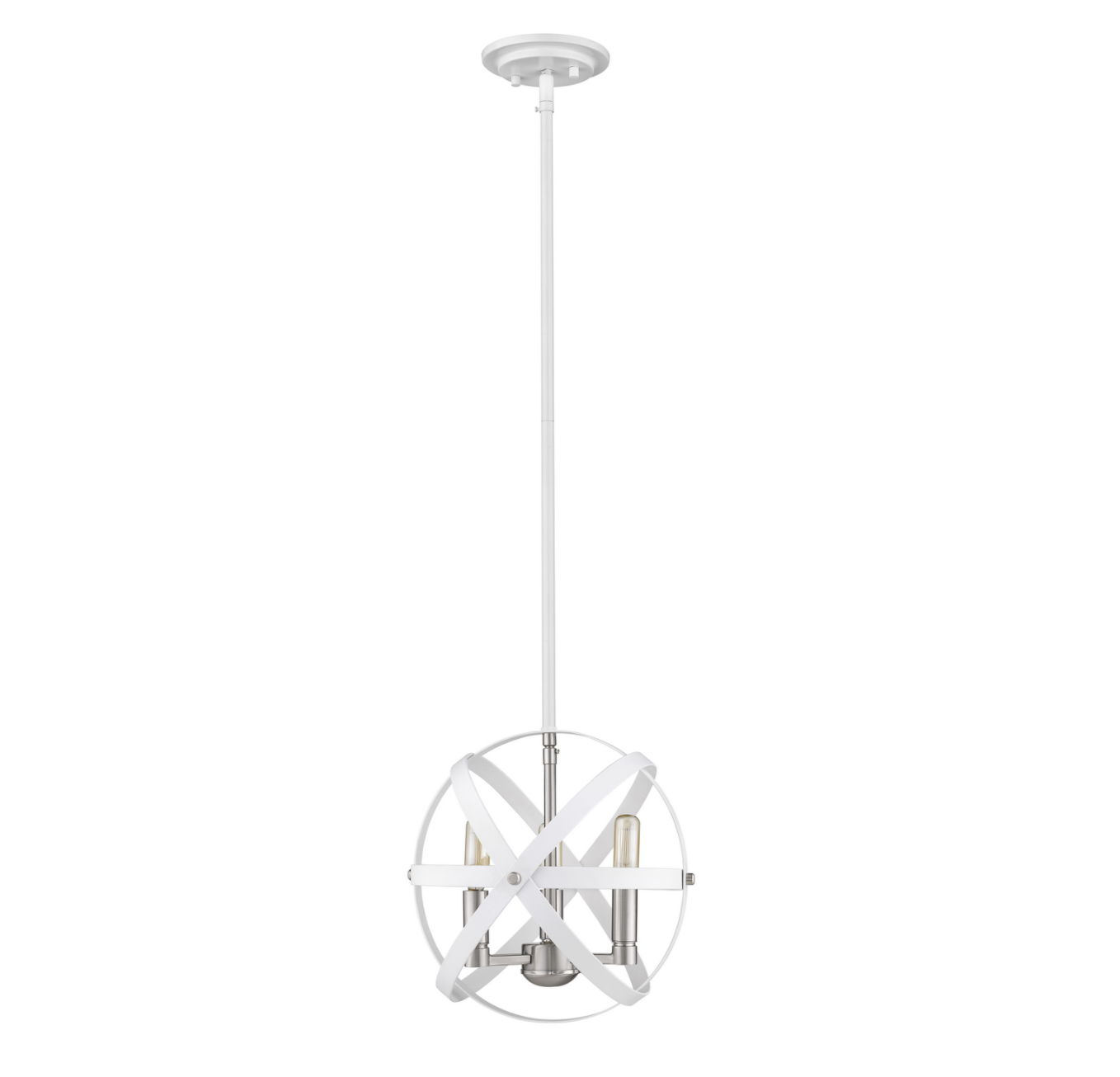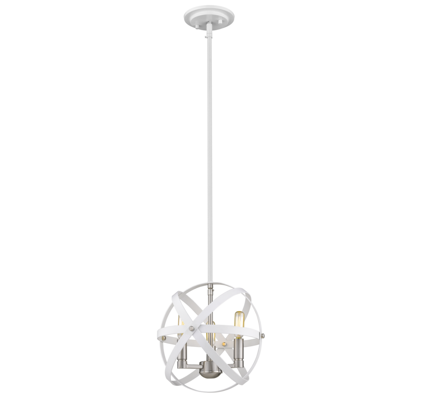This hammered white and nickel finish three-light pendant offers a light and airy ambiance and a perfect transitional motif with versatility. Stylish design weaves flat iron ribbons in an open orb shape that houses a collection of charming candelabra bulbs, creating a fun futuristic appeal.