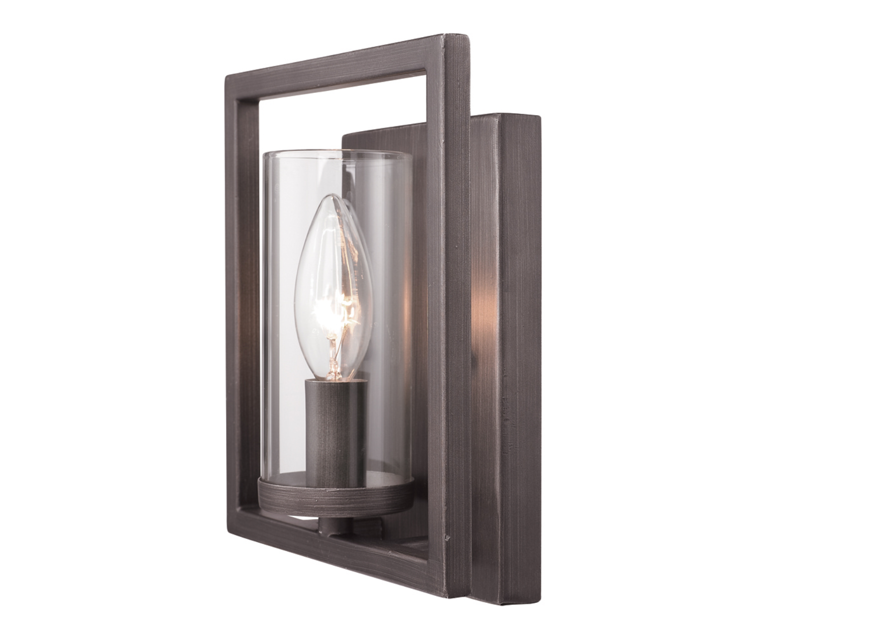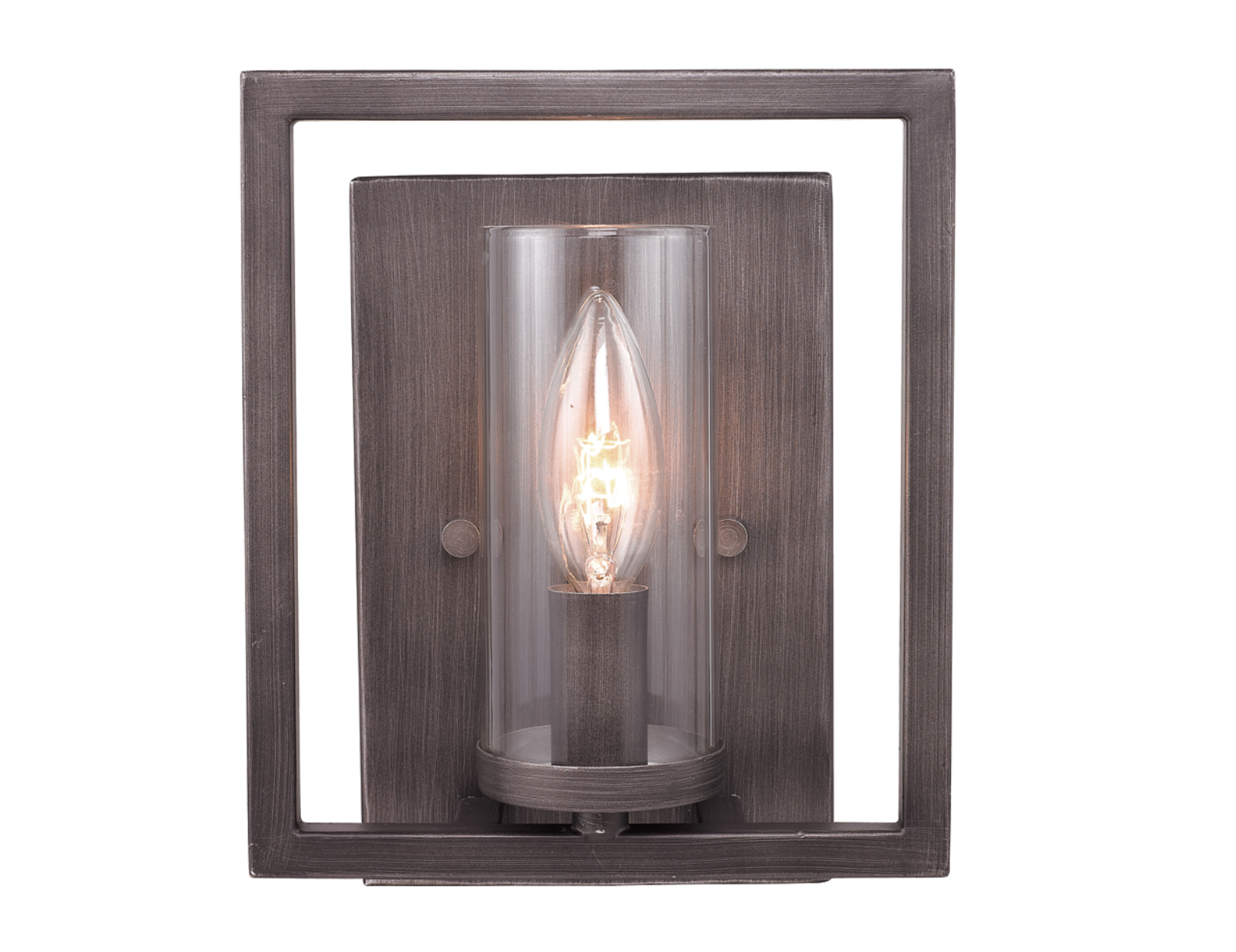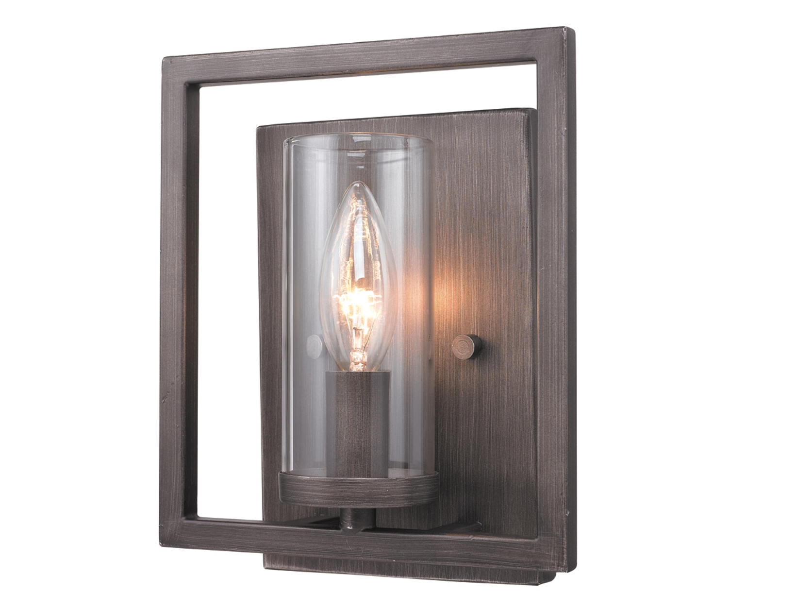Sleek angles and a geometric form make an ultra-modern statement in the Mallory collection. The series is offered in multiple finishes that heighten the light airy look. Clear Glass cylinders surround the stately silhouettes of candelabra bulbs. This sconce can be used in a hall, stairway, or foyer as an accent. It can be hung individually or as a pair.