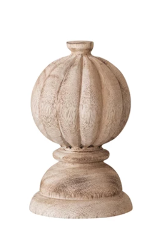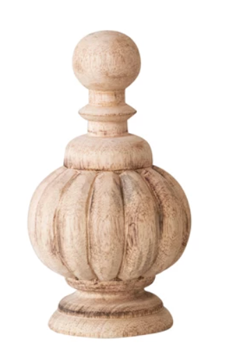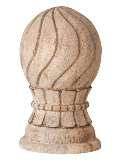 Bring elegance and charm to the home with these hand-carved mango wood finials. These finials are beautiful and functional pieces that can be used as decorations or bookends. The finials feature a bleached finish that gives them a light and airy look. The finials have a round shape that complements any style and space. The finials are made of mango wood material that is eco-friendly and durable. It is sourced from sustainable forests and has a natural grain and texture. The finials have a hand-carved design that creates a unique and intricate pattern on each piece. Each finial is different and one-of-a-kind. The finials come in three sizes: 5.5 inches in diameter and 9 inches in height, 4.5 inches in diameter and 8 inches in height, and 4.25 inches in diameter and 6.5 inches in height, making them a varied and attractive set. The finials can be displayed on a mantel, a shelf, or a table, creating a cozy and inviting atmosphere. These finials are versatile and can be used for farmhouse, French country, cottagecore, or transitional style decor. They are a perfect way to add elegance and charm to the home.