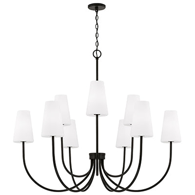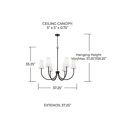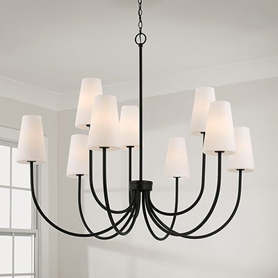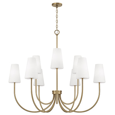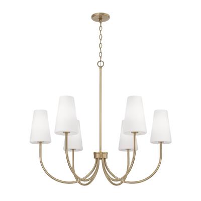 Classic curves and grand scale create the Averitt Medium Chandelier. The elongated Soft White glass tapered shades complement the sleek arms for elegant transitional style, while the Matte Black or Aged Brass finish creates sophisticated contrast.
