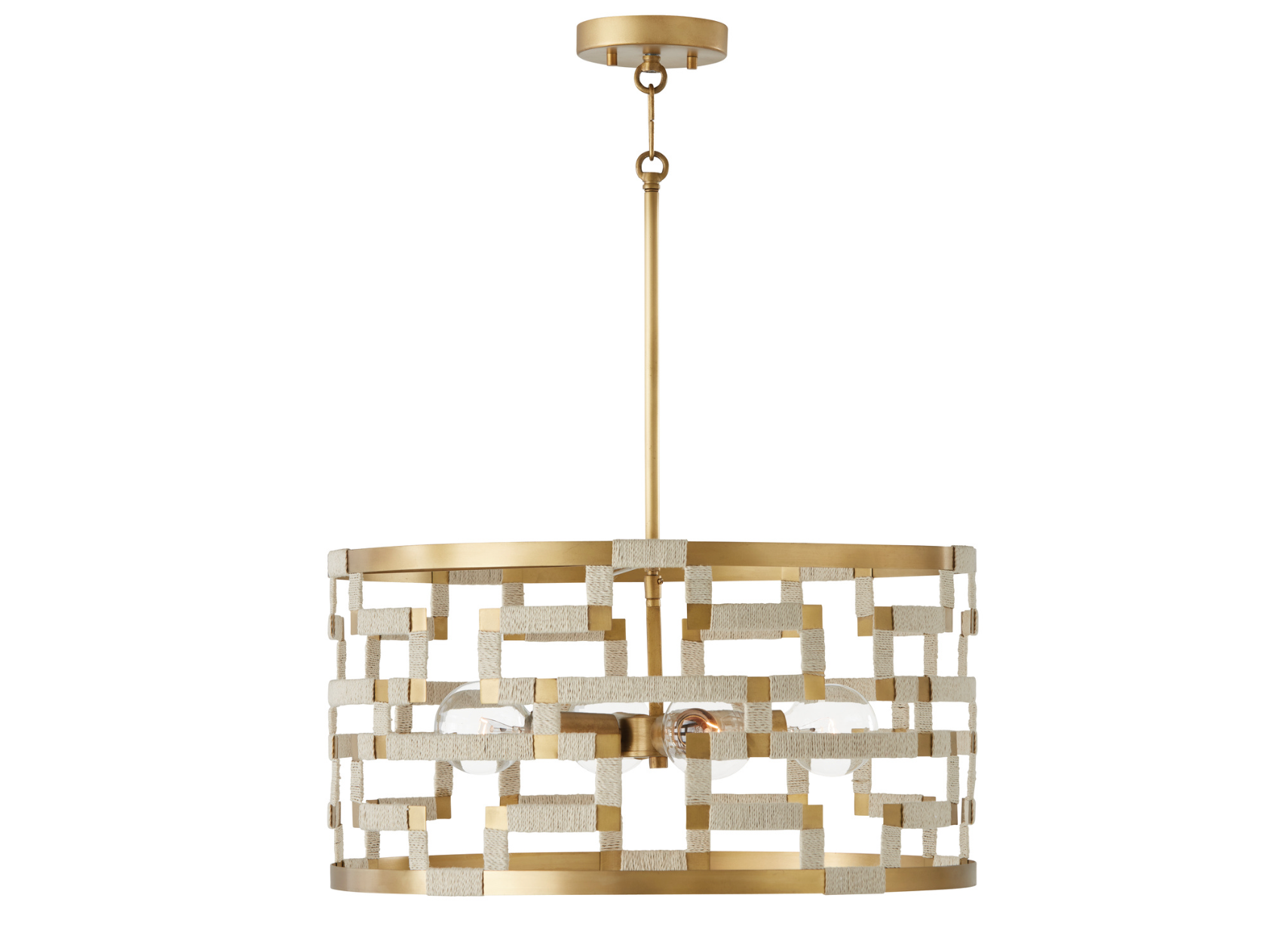 Naturally and graphically bold, the Nala 4-Light Pendant commands attention with its striking patternwork. The hand-applied patina on the unique brass finish accentuates the Greek key inspired design, while the bleached natural jute rope softens the sharp edges.