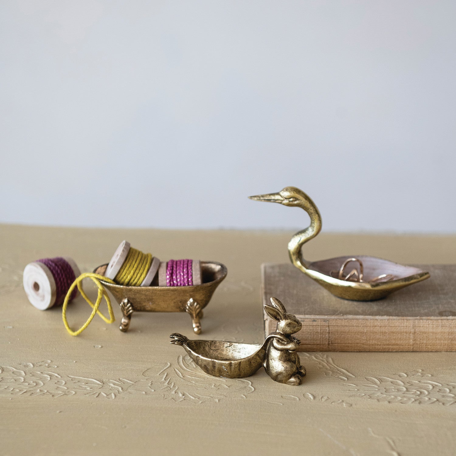 Playful and charming, this antique gold-finished pewter dish features a rabbit figure “pulling” a carrot-shaped bowl. Perfect for holding rings, keys, candies, or small treasures, it adds a whimsical touch to any tabletop or shelf décor.