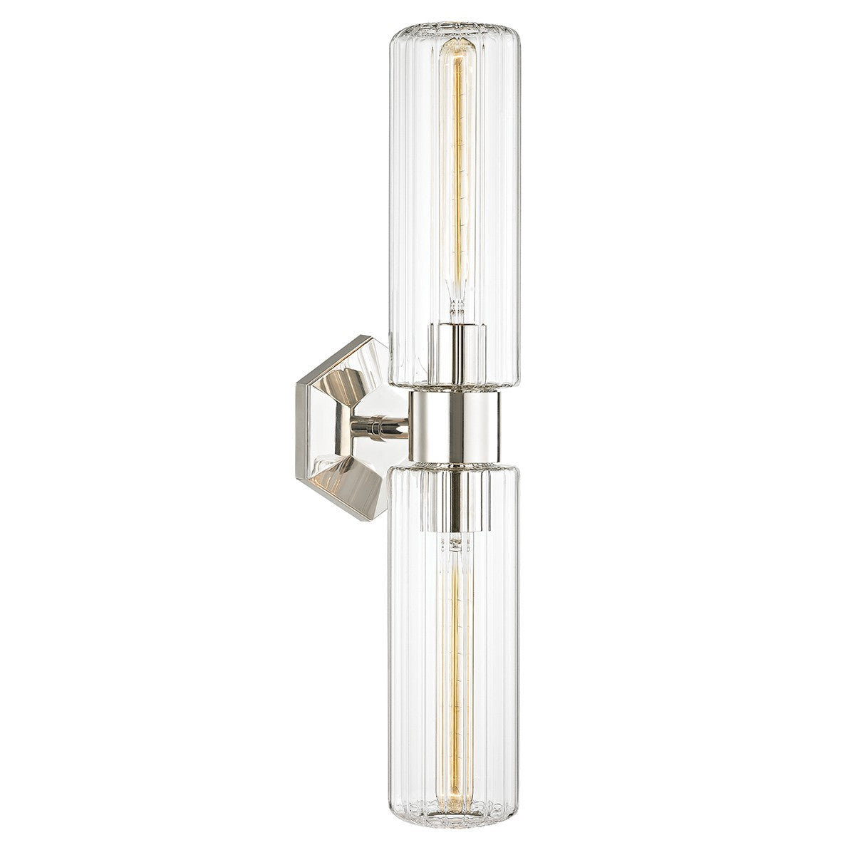 Decorative faceting and fluted glass give the Rosie sconce its distinctive graphic appeal. One or two tube shades extend from a central holder, creating an elevated version of an everyday staple. The unexpected focal point is the backplate, which has been faceted like a gem. Rosie is available in Aged Brass, Old Bronze, or Polished Nickel finishes.