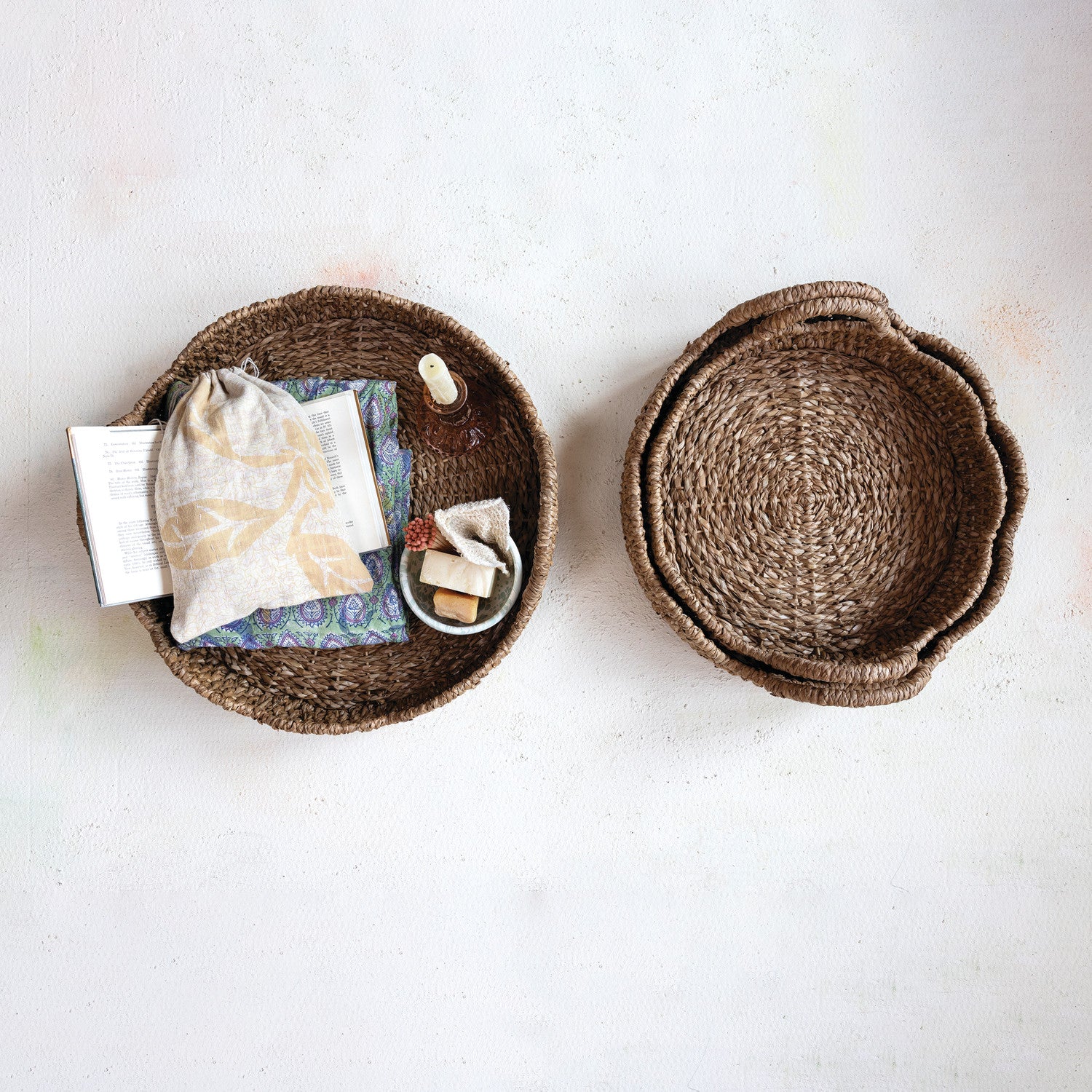 22"L x 18-1/2"W x 3"H, 20"L x 16"W x 3-3/4"H & 18"L x 14"W x 2-1/2"H Decorative Hand-Woven Bankuan Trays w/ Handles, Natural,