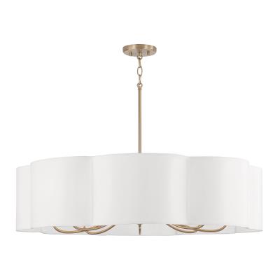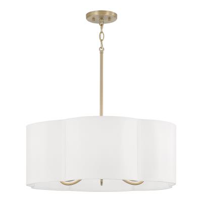 Evoking a floral form with chic designer details, the 24 inch wide Sabrina Pendant brings show-stopping style to any space. The sleek Matte Brass arms curve upward within the scalloped White fabric shade, making this unique luminaire captivating from every angle.