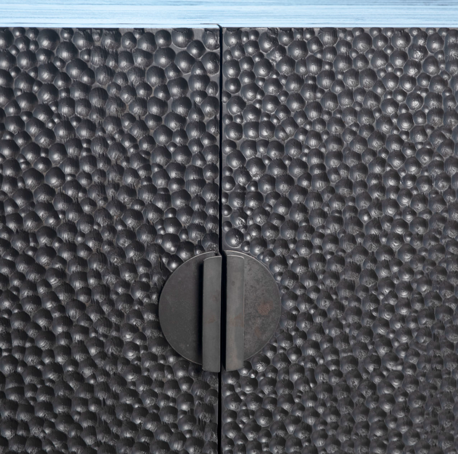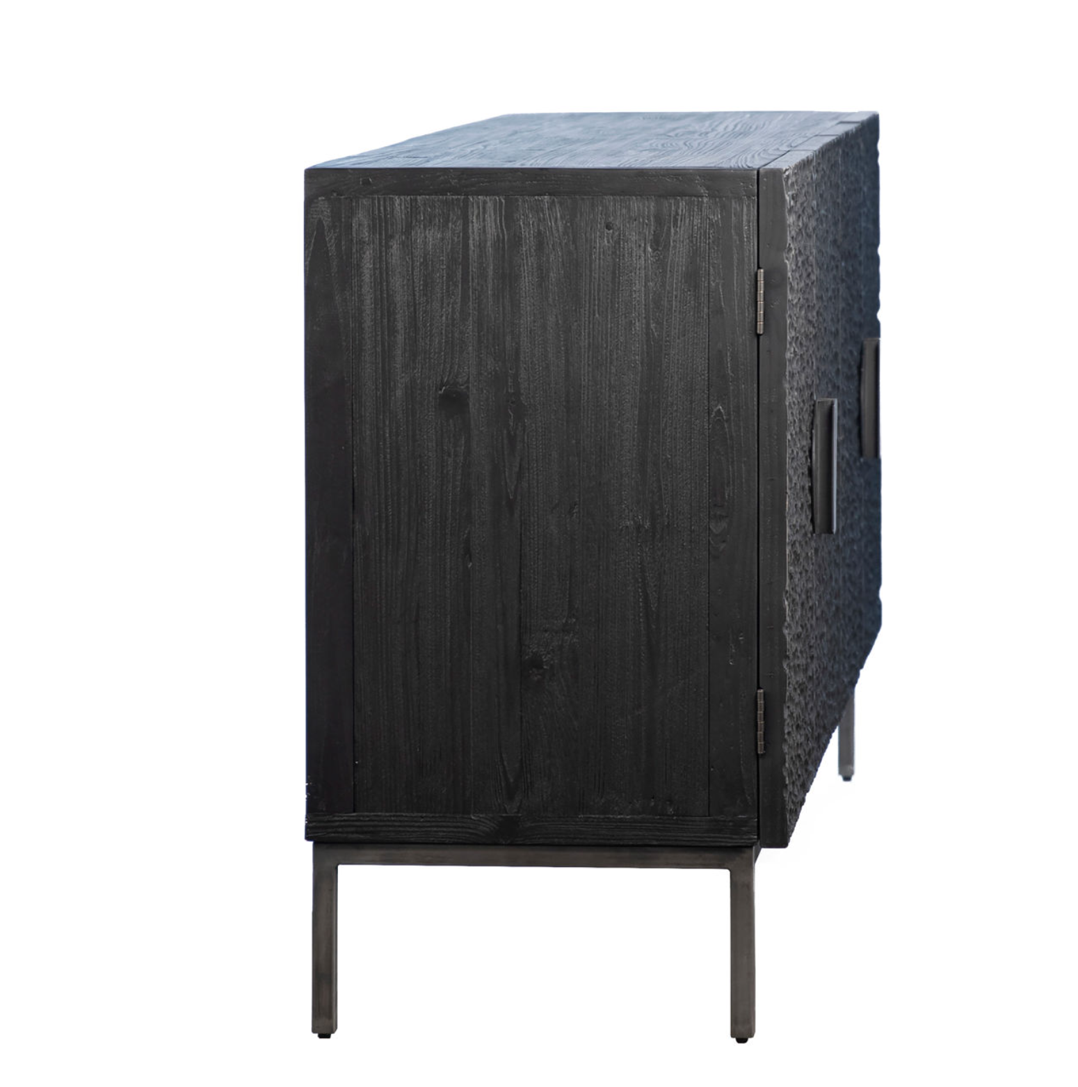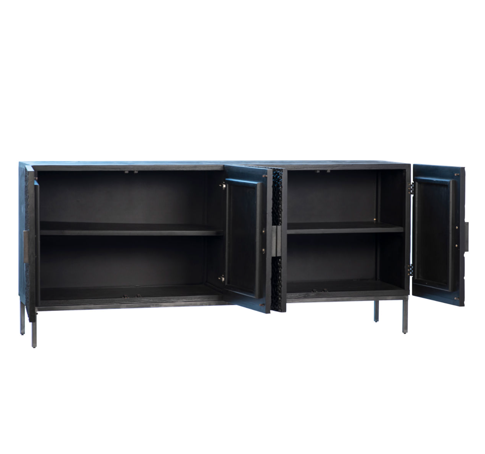 Give guests something to talk about with this beautiful 79" Skye Sideboard. Made of reclaimed pine wood and finished in a rich black stain, the unique door-front texture will beg to be touched. The four door fronts are complimented by striking semi-circular iron handles for easy opening. The interior boasts 2 large storage shelves for all your entertainment needs.