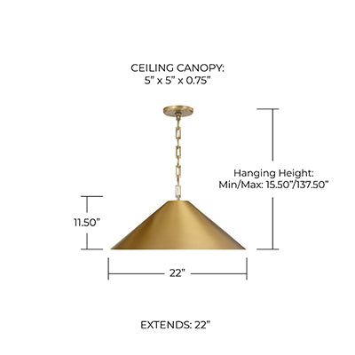 Both simple and stunning, the Stetson Pendant brings captivating style to any space. The brushed Aged Brass finish adds dimension to the inch wide cone shape, while the unique rectangular decorative chain delivers high design detail.
