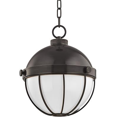 The hanging globe—half opaque white glass diffuser, half metallic shell—is a perennial favorite. In our Sumner family, thumbscrews with lathe-cut knurling add to its industrial evocations.