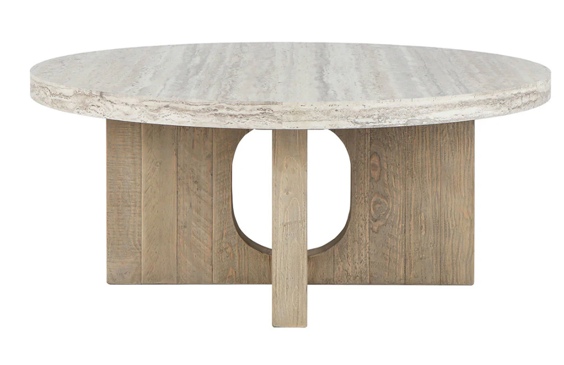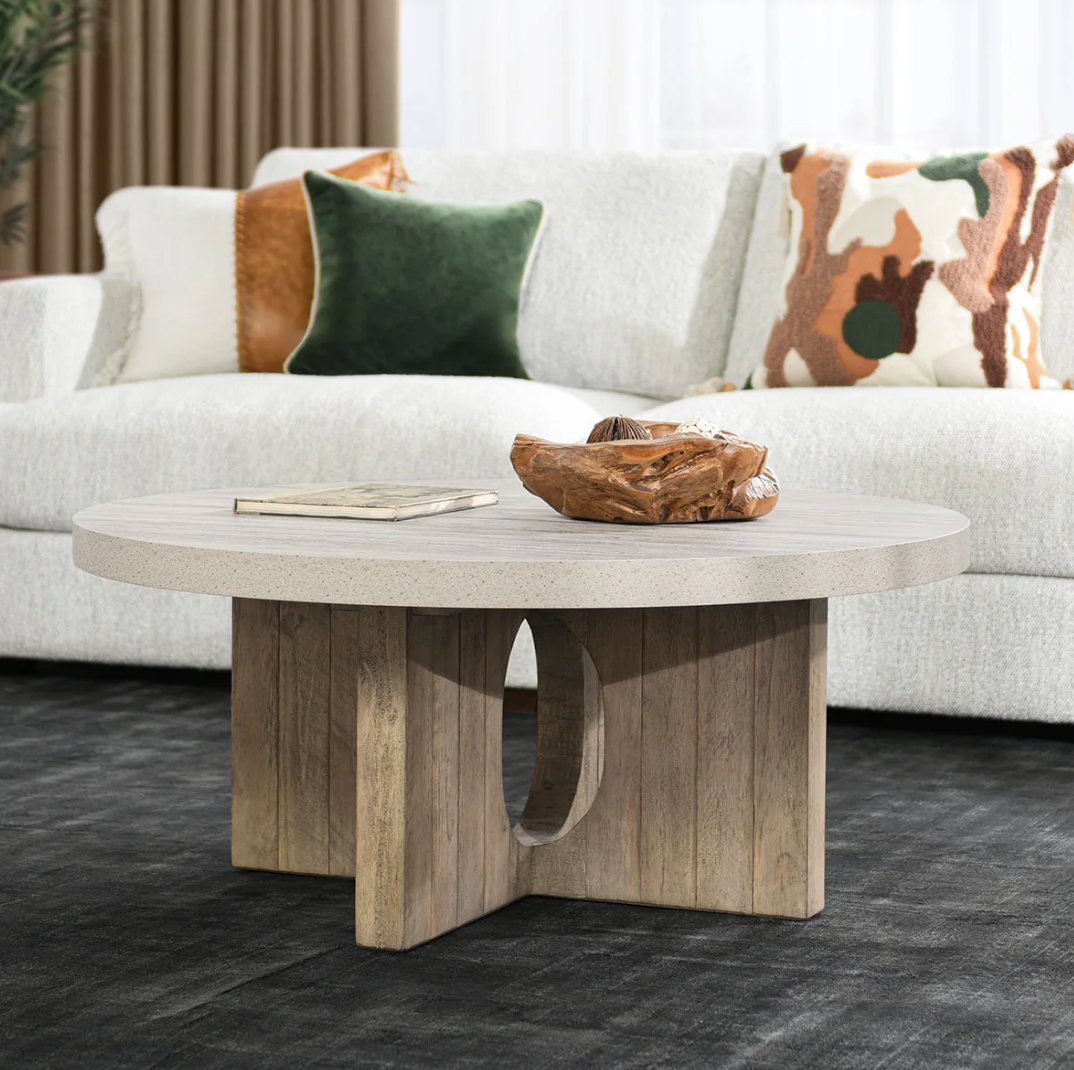 The Tally Round Coffee Table is crafted from FSC® Certified reclaimed pine with a concrete laminate top, blending a mixture of design and organic elements. Its combination of materials creates a smooth and cohesive aesthetic. Perfect for achieving a balanced and inviting atmosphere.