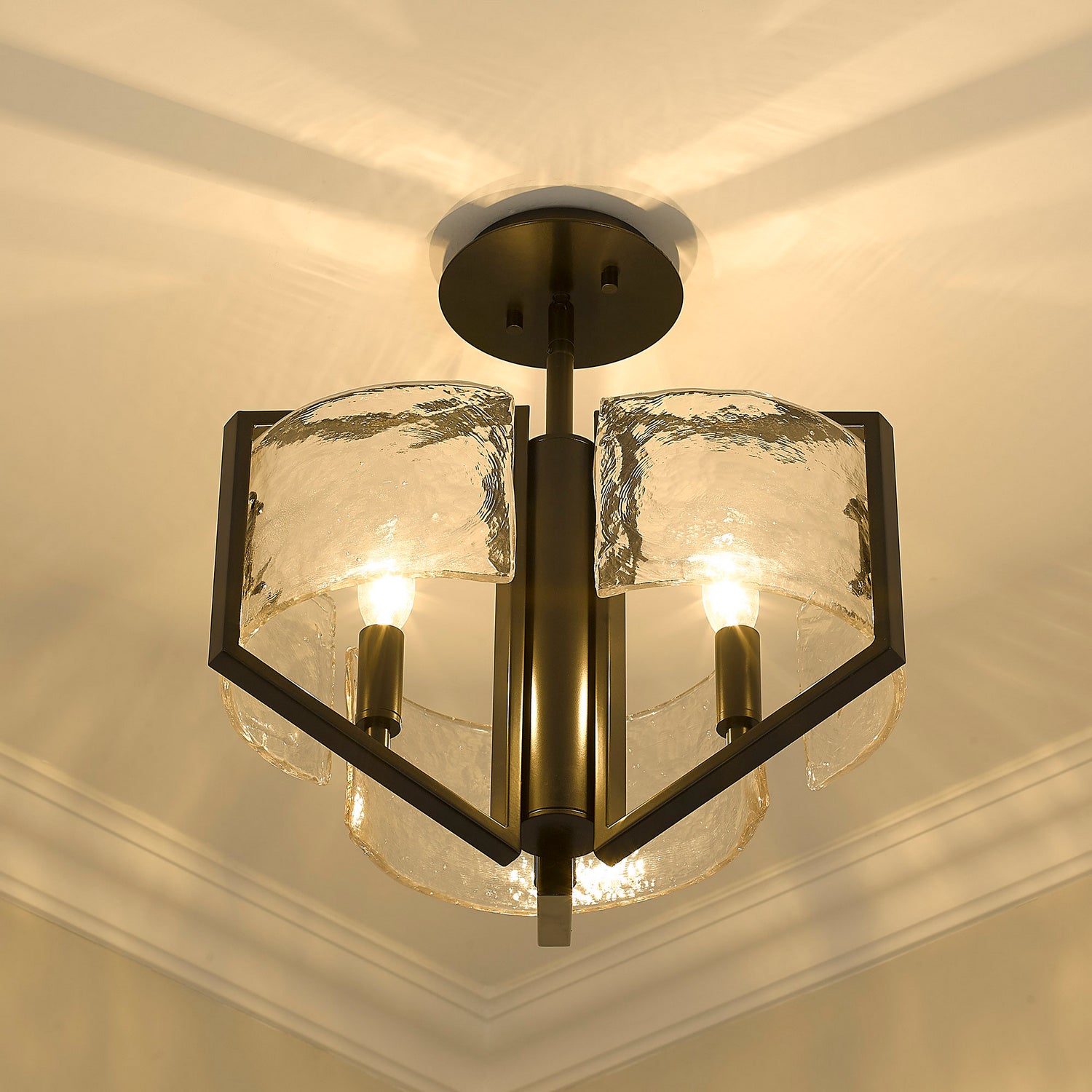 The beauty of water is the inspiration behind the contemporary Velma collection. Create a relaxed mood with this modern interpretation of refractive water. Drift on the waves of the thick artisan glass with no worries of being swept away by a current. Strong geometric arms carry the Hammered Water Glass while veiled screws hold the panels in place. The frame's repetitive boxes converge to create a center column. Strong candelabras sit upon wide cups that are partially concealed behind the beautiful glass. The smooth matte black finish offers a sophisticated feel. This semi-flush is ideally sized for a foyer.