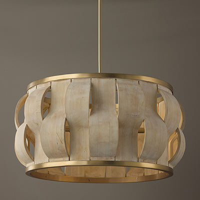 The Willa Large Pendant artfully brings the outdoors in. Artisan crafted pieces of Bleached mango wood create alternating curves on the drum silhouette, giving glimpses of illumination from within. The Matte Brass finish offers a warm shine, bringing a beautiful balance to this unique, structural luminaire.