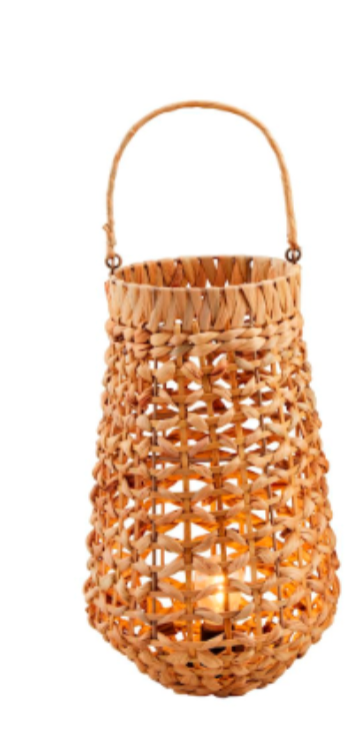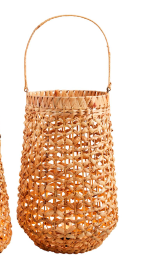 woven water hyacinth lanterns feature battery operated attached light bulbs.