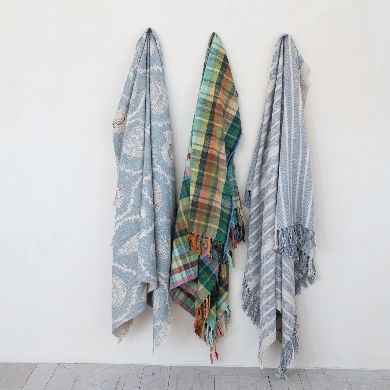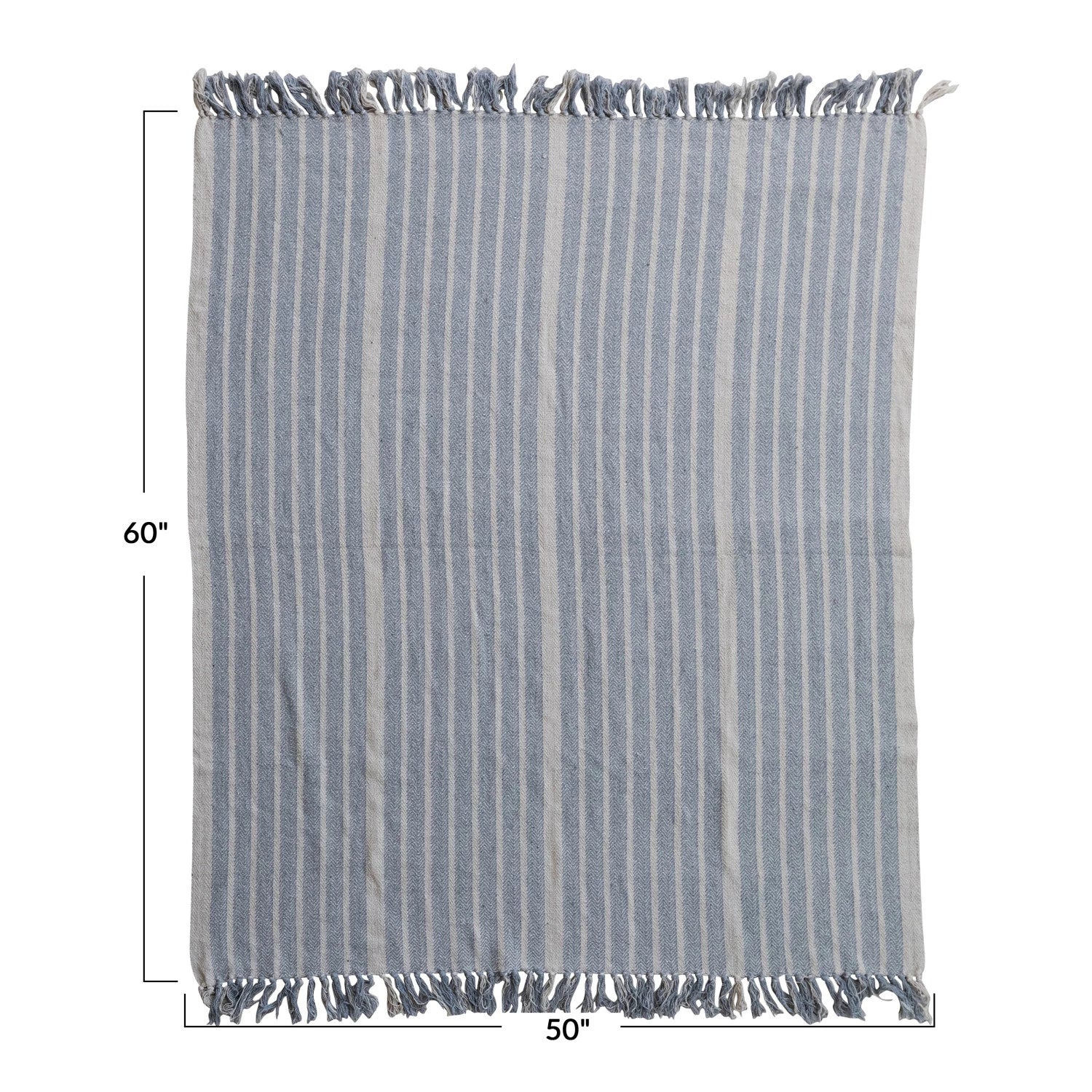 60"L x 50"W Woven Recycled Cotton Blend Throw w/ Stripes & Fringe, Blue & Natural